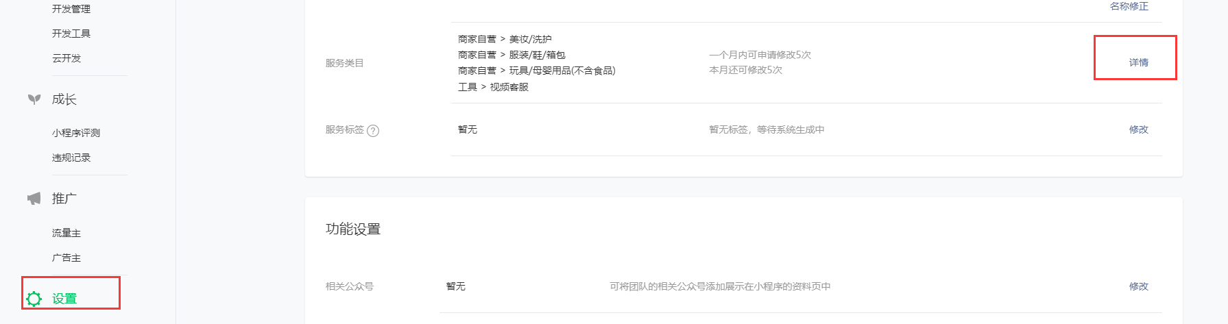 2、审核的小程序首页内容、产品等,务必跟小程序本身选择的服务类目(小程序平台mp.weixin.qq.com — 设置 — 基础信息 — 服务类目)一致。