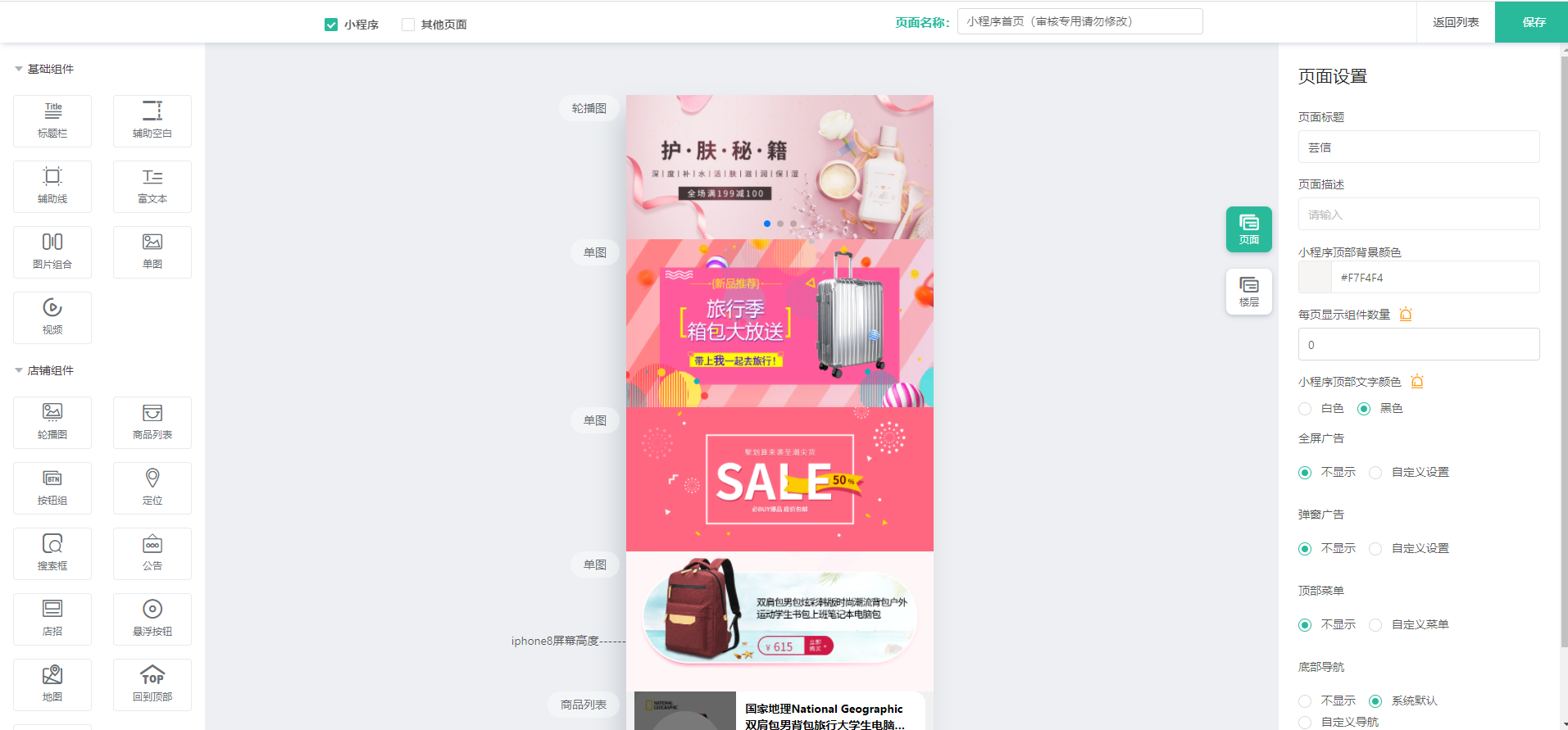 (1)小程序首页装修——建议放置图片(单图、轮播图等)和商品组件(商品组件不能勾选‘会员价’,否则基本要求授权登录),不建议放搜索框组件。默认请求授权登录的组件有:优惠券/定位/签到/自定义表单/幸运大转盘/在线客服推荐客服列表/门店/门店排名等组件,审核页面不能放这些组件。