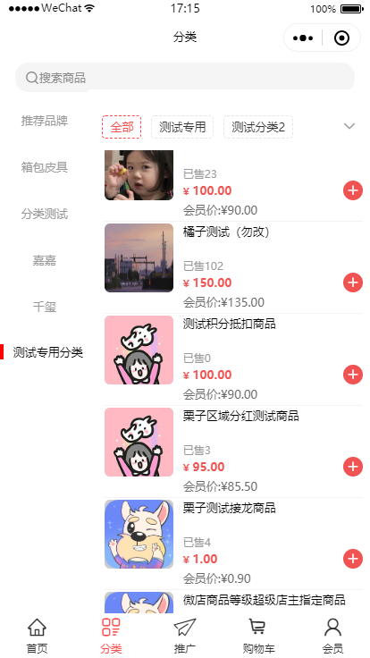 2、分类调整:将体验测试的产品统一归在一个分类下,审核期间将该分类关闭、不显示即可;或者自定义小程序的底部导航不要加上“分类”这版块,如下图所示