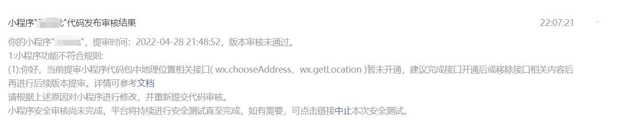 五、审核失败理由:你好,当前提审小程序代码包中地理位置相关接口(wx.chooseAddress获取用户收货地址、wx.getLocation获取当前的地理位置、速度)暂未开通,建议完成接口开通后或移除接口相关内容后再进行后续版本提审。详情可参考文档