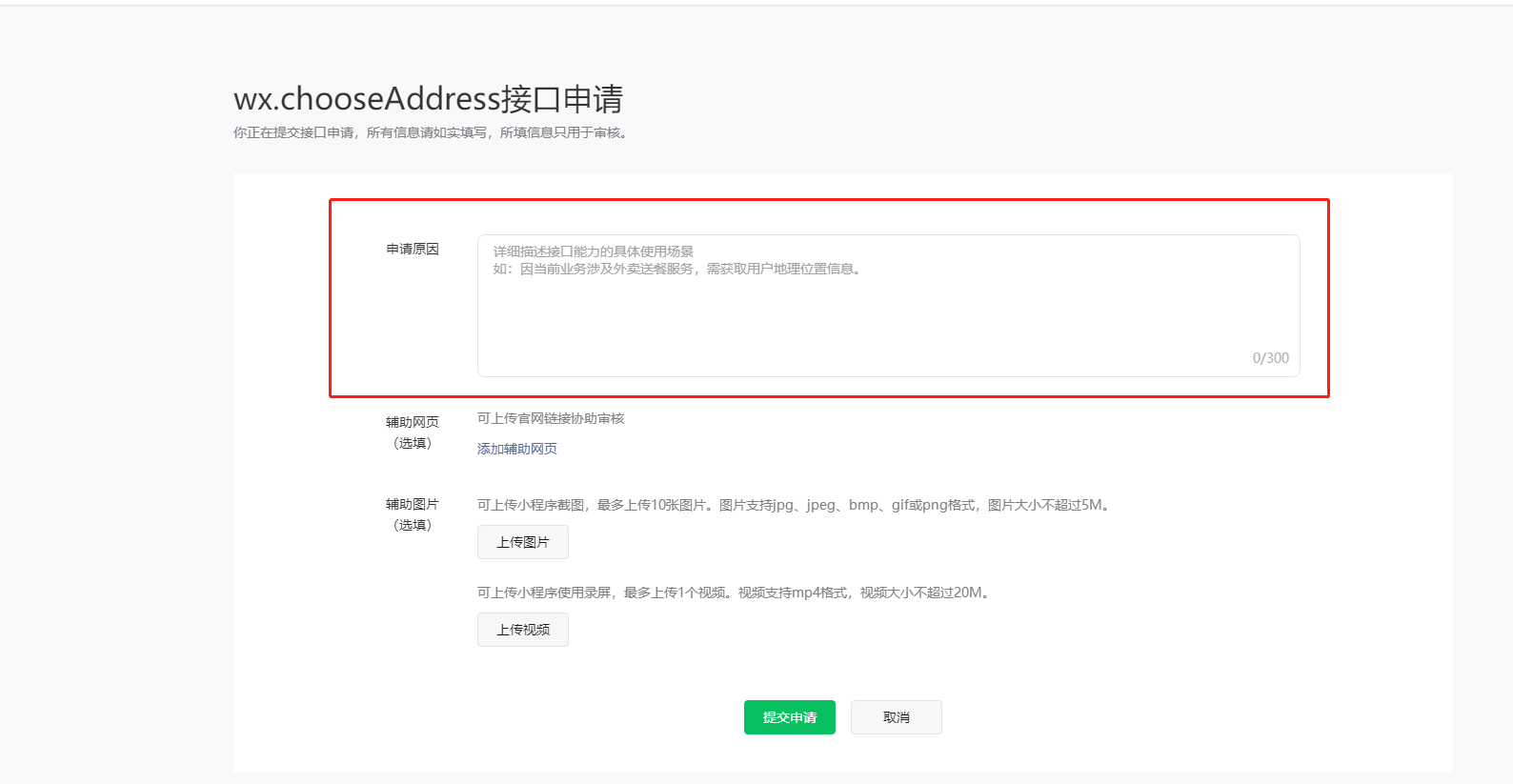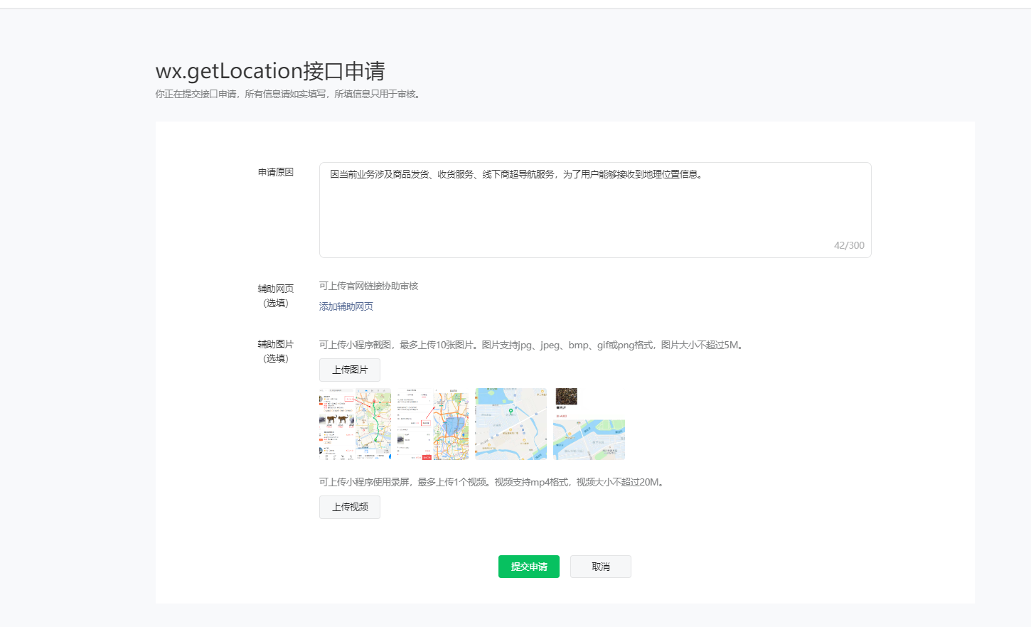 新:当提交wx.getLocation接口多次审核,有上传辅助图片和视频,被多次驳回审核不通过了时候,可以更换一下申请原因