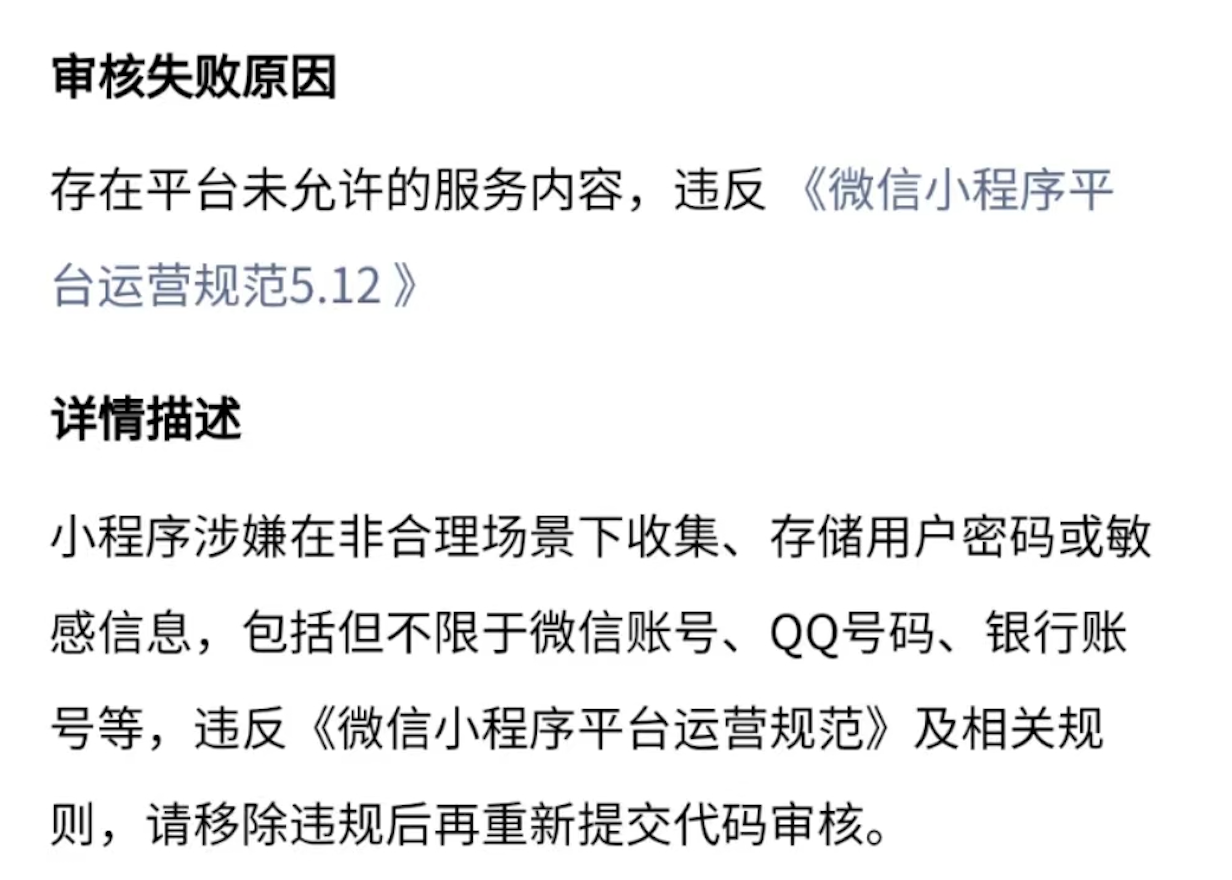 详情描述:小程序涉嫌在非合理场景下收集、存储用户密码或敏感信息,包括但不限于微信账号、QQ号码、银行账号等,违反《微信小程序平台运营规范》及相关规则,请移除违规后再重新提交代码审核。