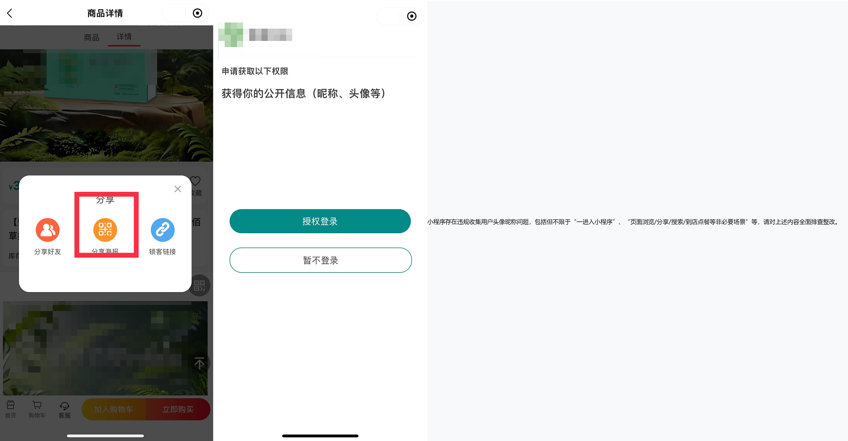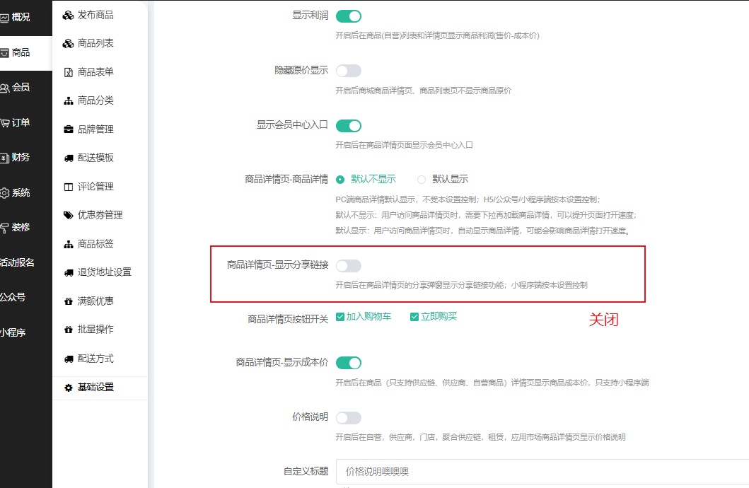 (5)如商城有小程序链接/视频号拓展链接工具/公转私链接插件注意暂时不要开启,商品列表–基础设置–商品详情页-显示分享链接也关闭,商品详情页分享会显示对应按钮,点击会弹出强制授权,也会被驳回