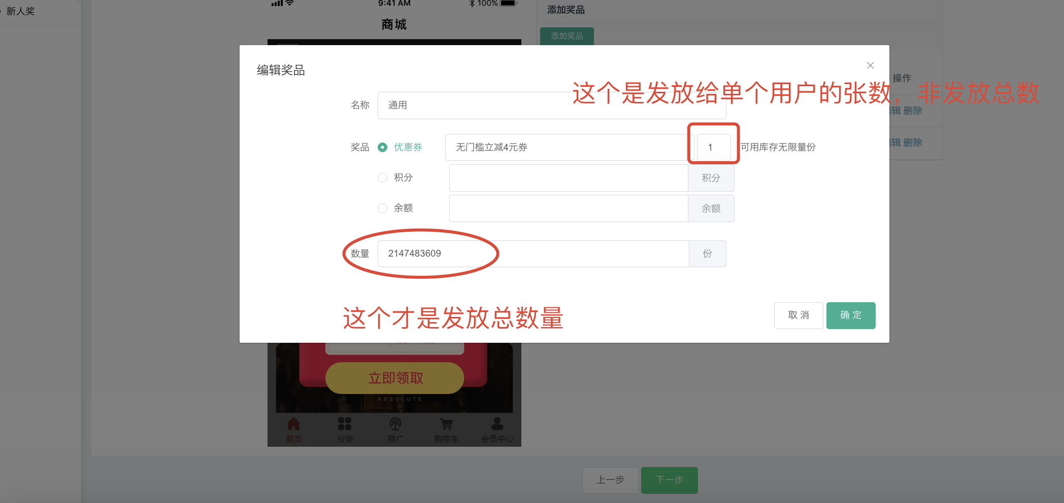 注意:对应设置优惠券的后面框是填写发放给单个用户的张数,非发放总数,下面的数量才是总的发放数量。