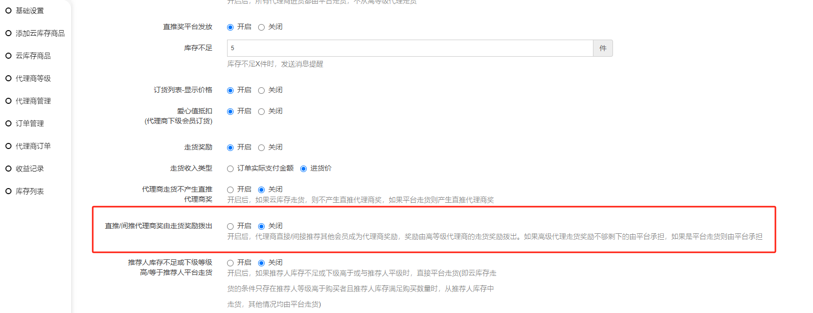 11)代理商走货不产生直推代理商:开启后,如果代理商走货,则不产生直推代理商奖,如果平台走货则产生直推代理商奖