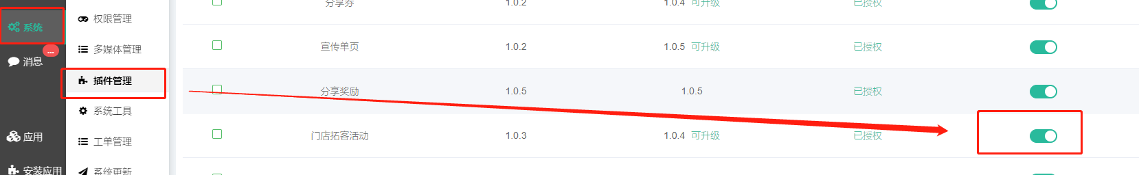 2、 启用后可在门店收银台插件左边菜单底部看到门店活动管理、门店活动审核菜单