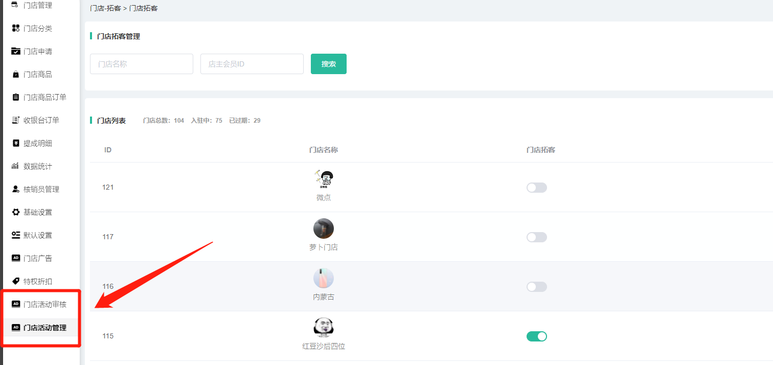 4、点击门店活动审核菜单,可给单个门店开启门店拓客活动功能