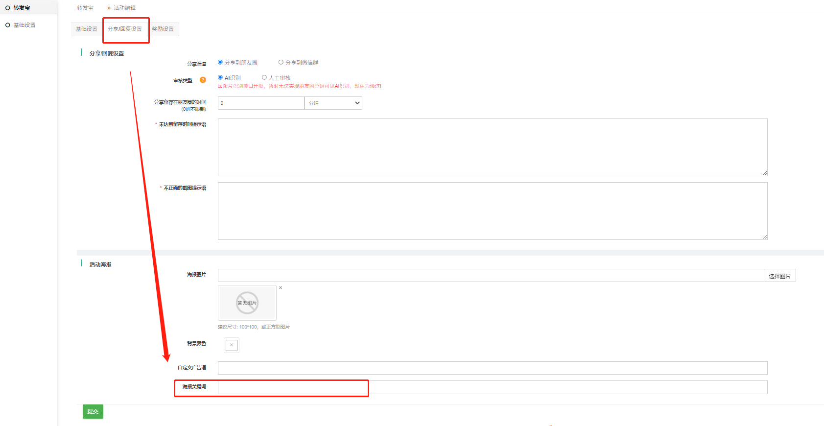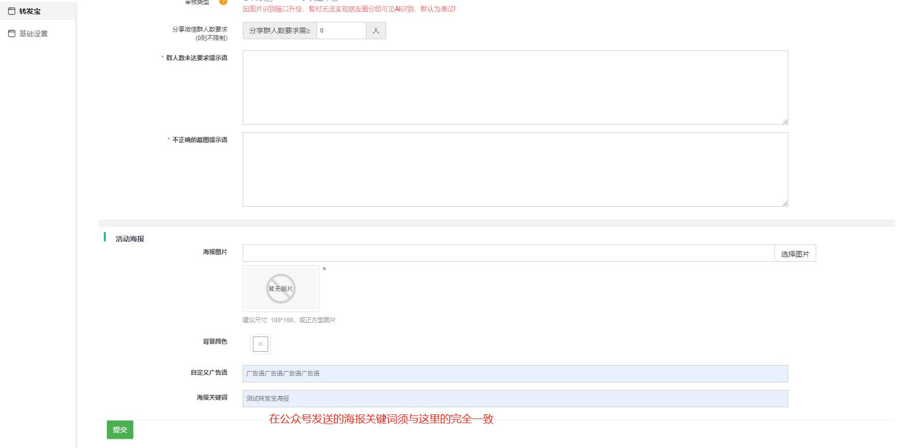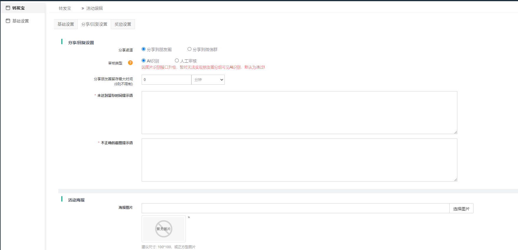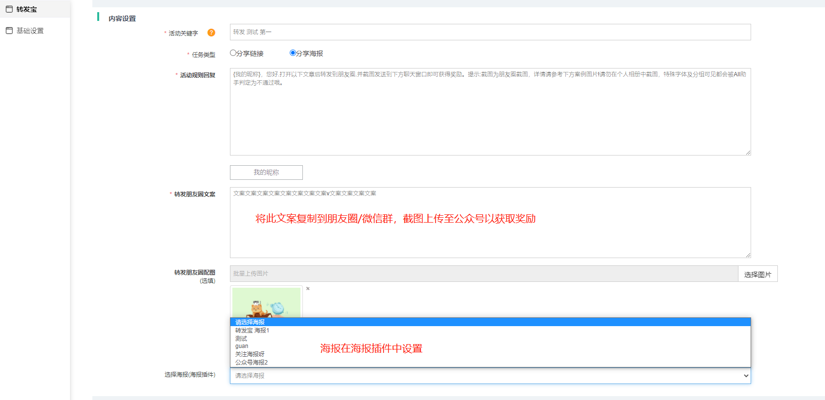 活动海报:转发宝可以生成活动推广海报,需设置活动海报、背景图、自定义广告语、海报关键词(关键词不能与商城已有的关键词重复,比如商城新海报插件或公众号自动回复关键词已有‘A’关键词,转发宝活动海报关键词也不能设‘A’。)