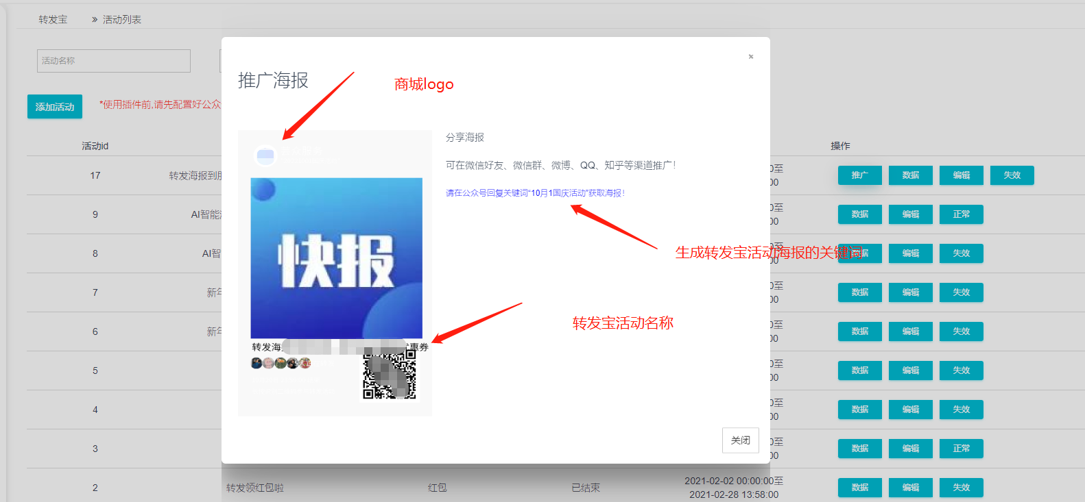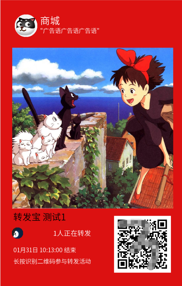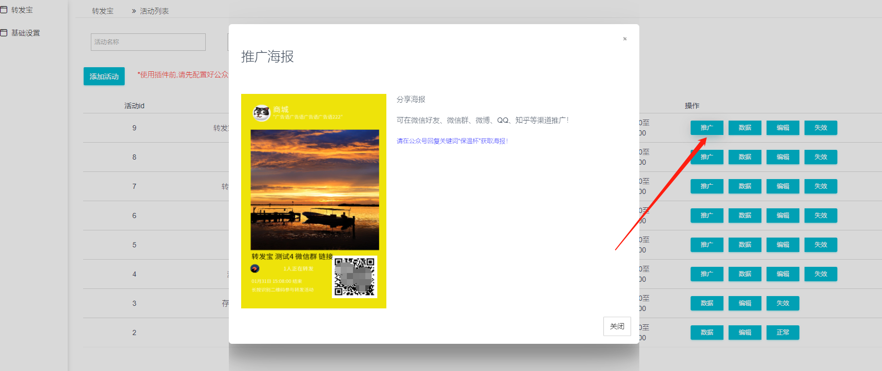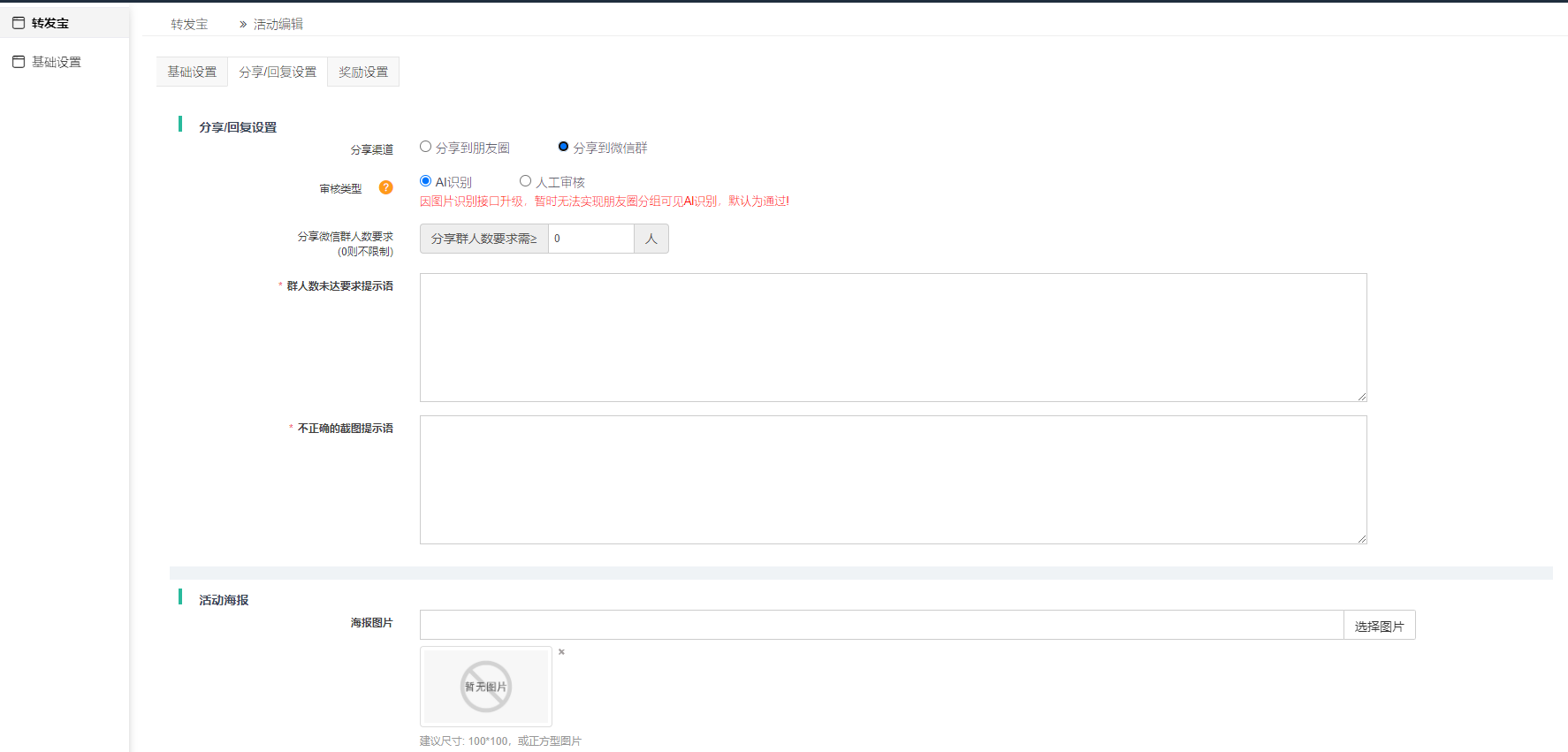 活动海报:转发宝可以生成活动推广海报,需设置活动海报、背景图、自定义广告语、海报关键词(关键词不能与商城已有的关键词重复,比如商城新海报插件或公众号自动回复关键词已有‘A’关键词,转发宝活动海报关键词也不能设‘A’。)