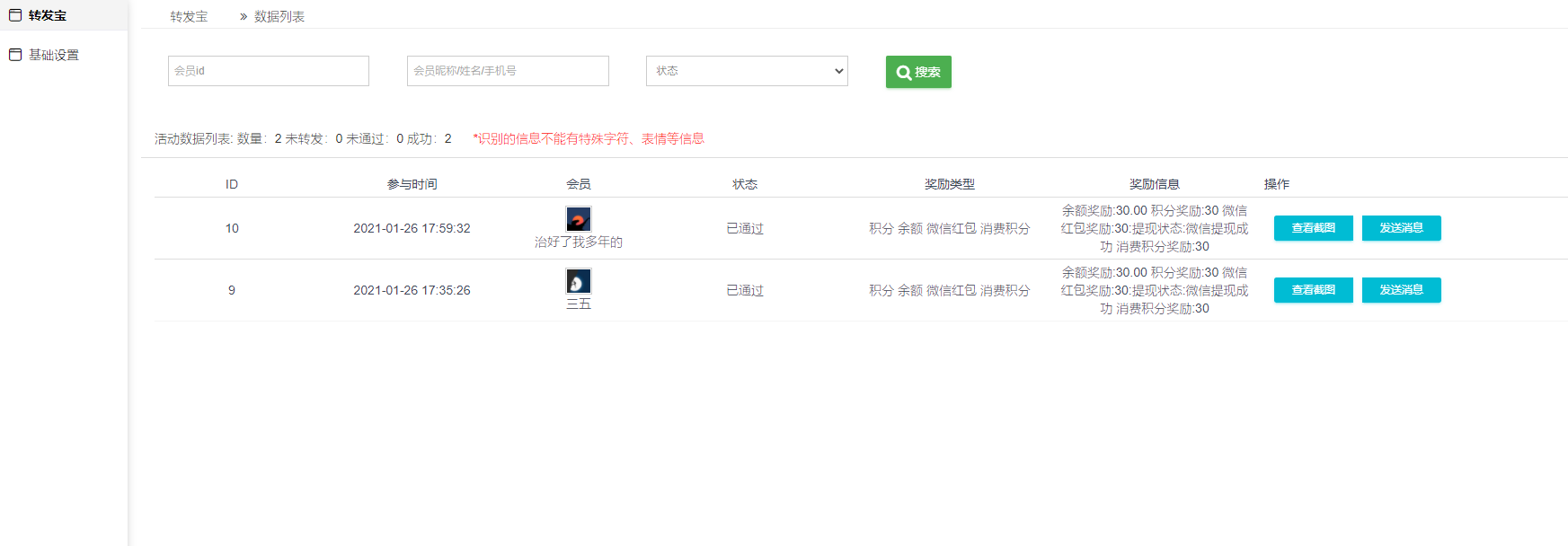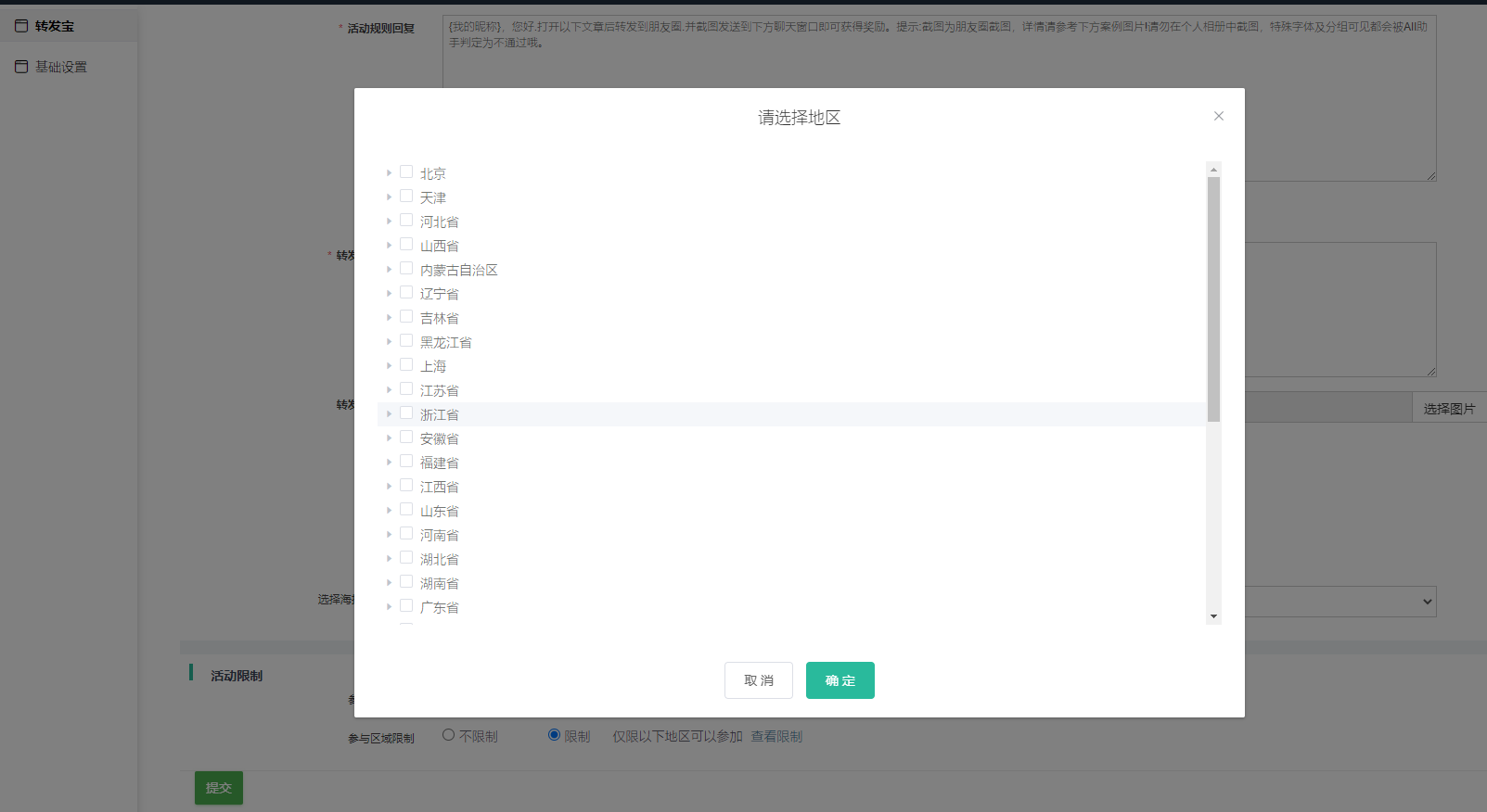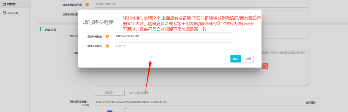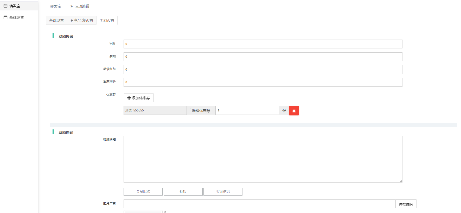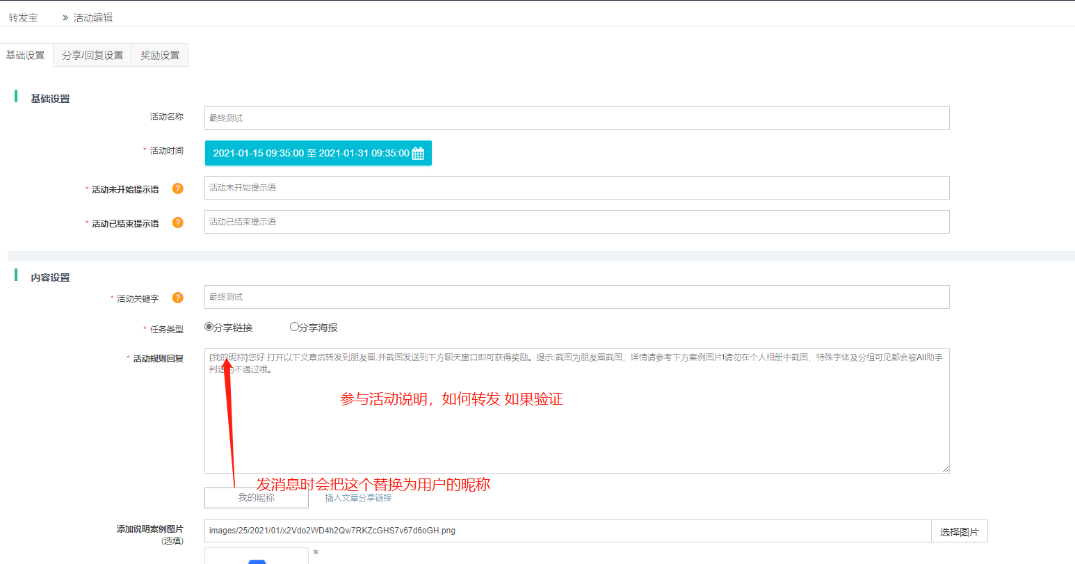 活动海报:转发宝可以生成活动推广海报,需设置活动海报、背景图、自定义广告语、海报关键词(关键词不能与商城已有的关键词重复,比如商城新海报插件或公众号自动回复关键词已有‘A’关键词,转发宝活动海报关键词也不能设‘A’。)