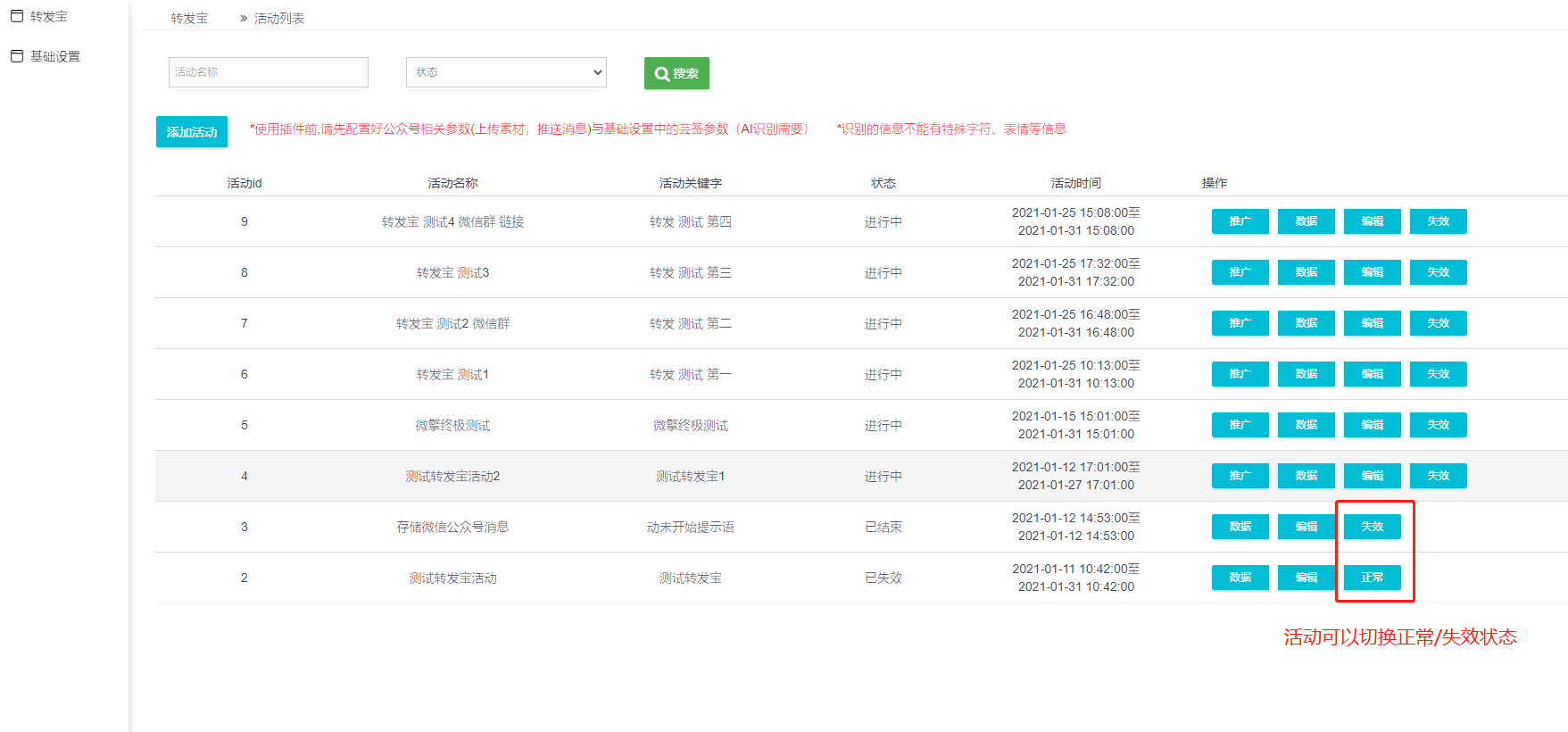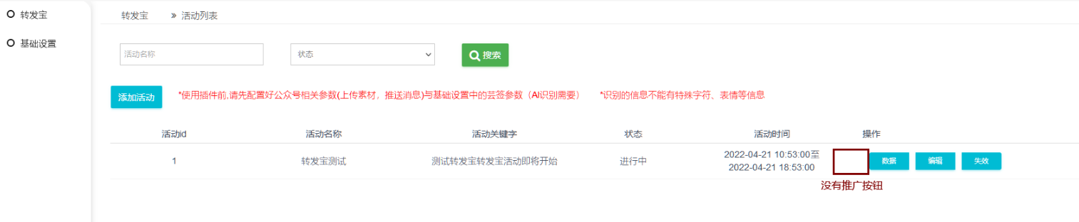 A:转发宝活动–分享/回复设置–活动海报,要填写海报关键词,才会显示推广按钮.