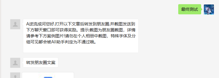 当活动任务为分享海报时:扫码后公众号会发送海报文案,复制文案分享到微信群或发朋友圈,再截图上传到公众号获取奖励