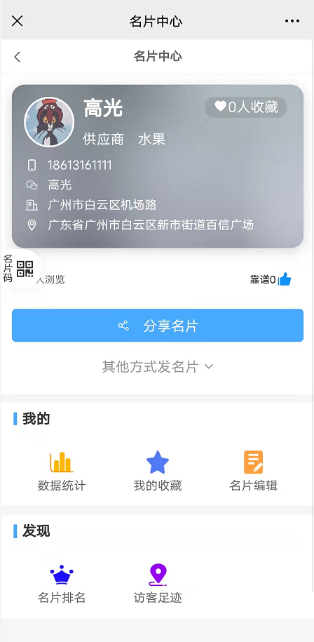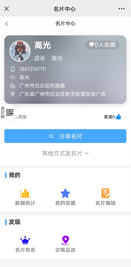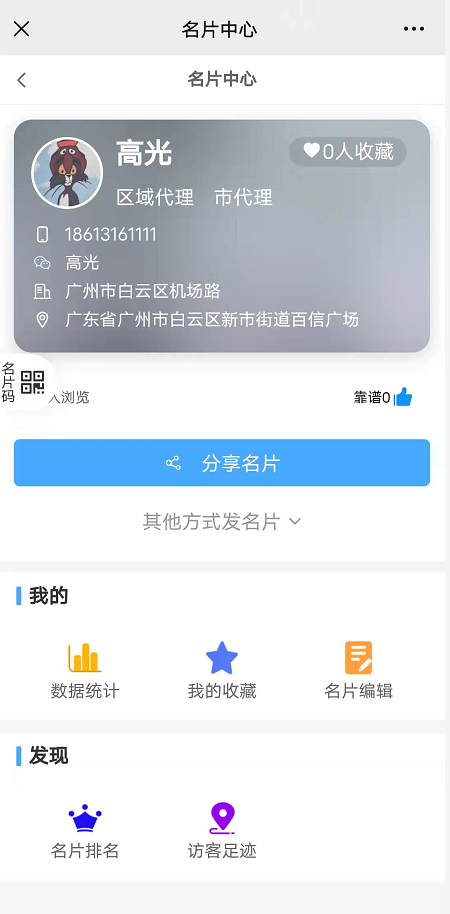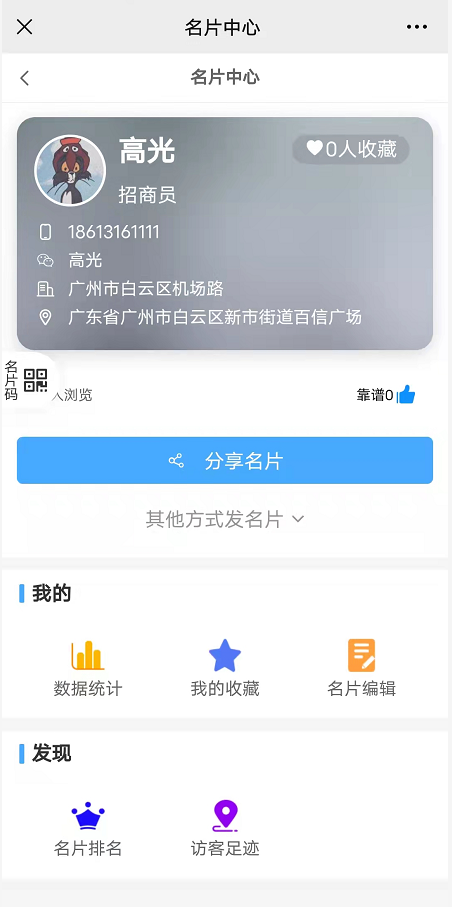 3、数据统计:多维度统计名片访问、分享、保存、靠谱、收藏等数据。如下图