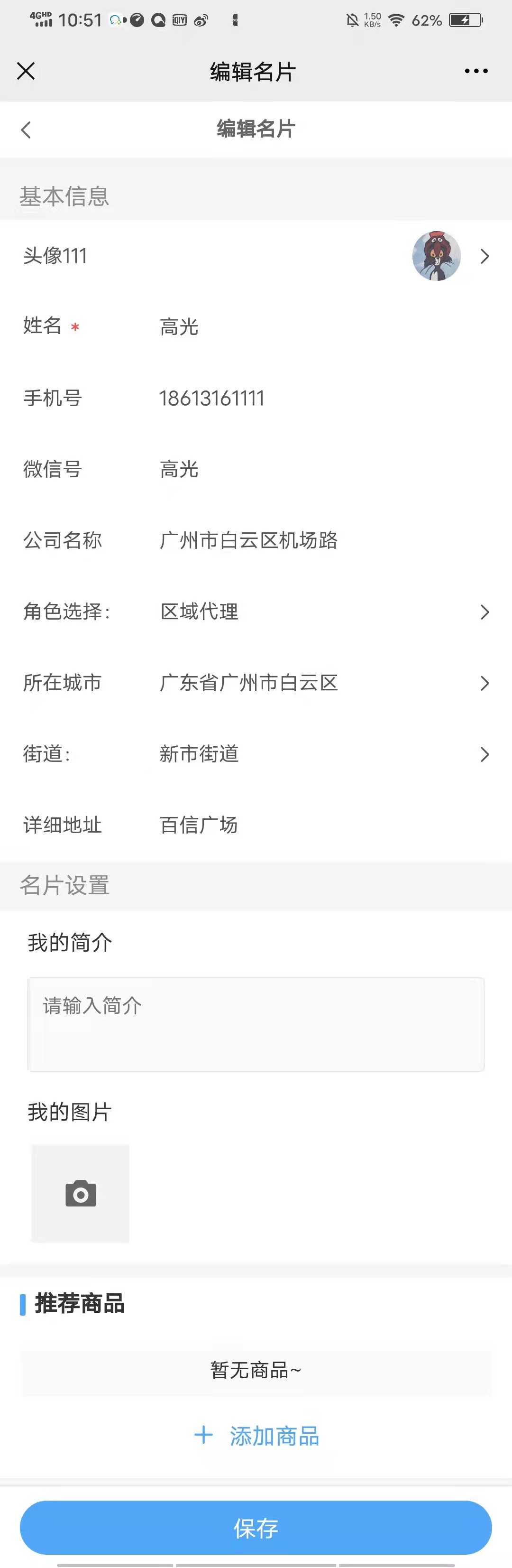 2、名片编辑:支持名片开启/关闭、会员基本信息设置、简介设置、个人图片、个人语言、推荐商品选择等。