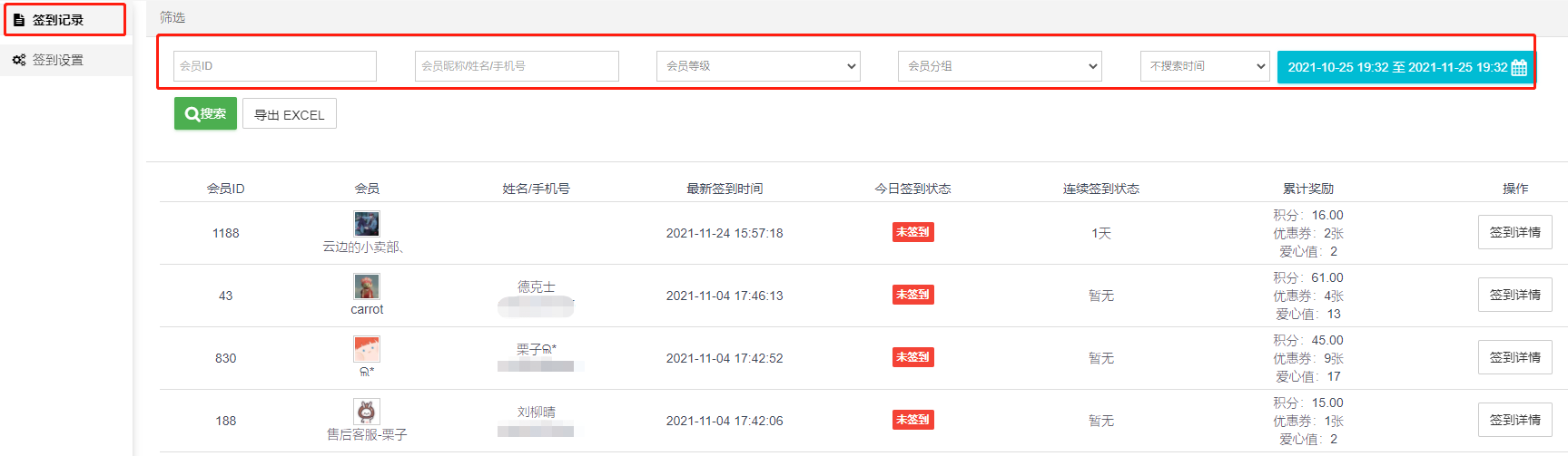 3)会员签到记录支持搜索筛选导出操作;