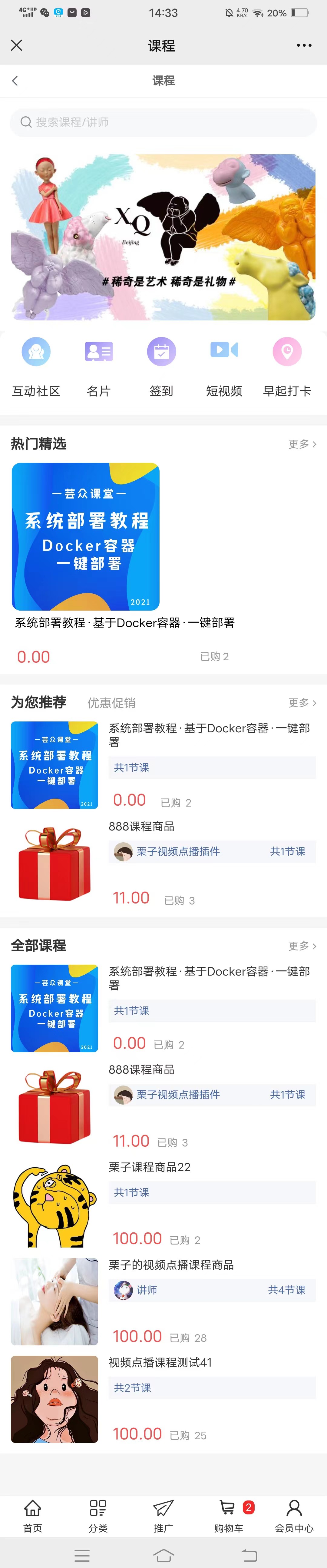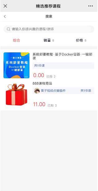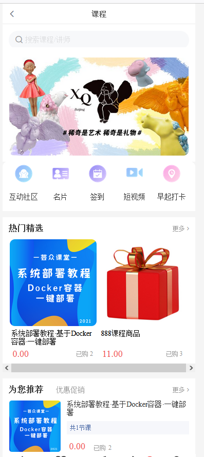(2)推荐、热卖这类别在聚合页只显示四个商品(商品若有设排序,排序数字大靠前显示,否则随机显示),可分别点击进去查看更多课程,亦可进去里面搜索课程