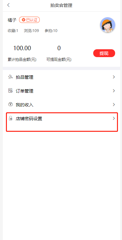 3、拍卖官可以将自己的店铺设置密码,设置密码后,店铺显示在贵宾厅聚合页,前端进入店铺需要输入店铺密码