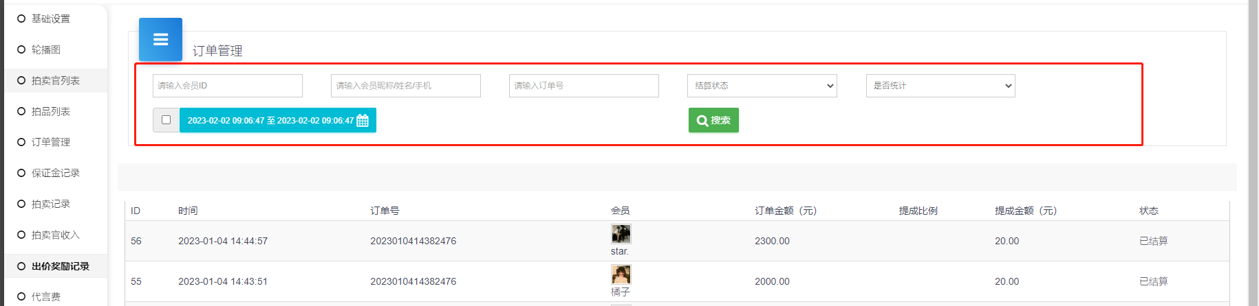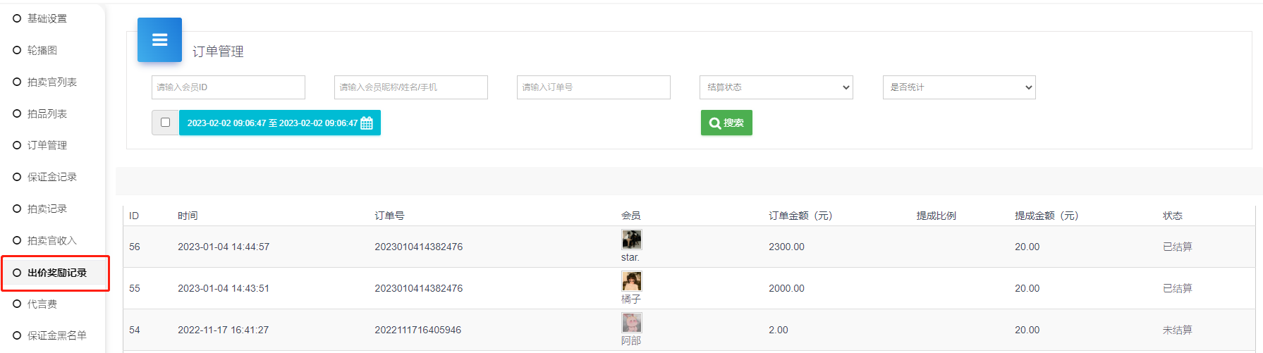 出价奖励记录作者: aishidai / 2025年11月21日 1、出价奖励记录列表,查看奖励时间、对应订单号、奖励会员、订单金额、提成比例、提成金额、结算状态; 2、通过会员ID、会员昵称/姓名/手机号、订单编号、结算状态、时间,可以搜索对应的出价奖励记录;