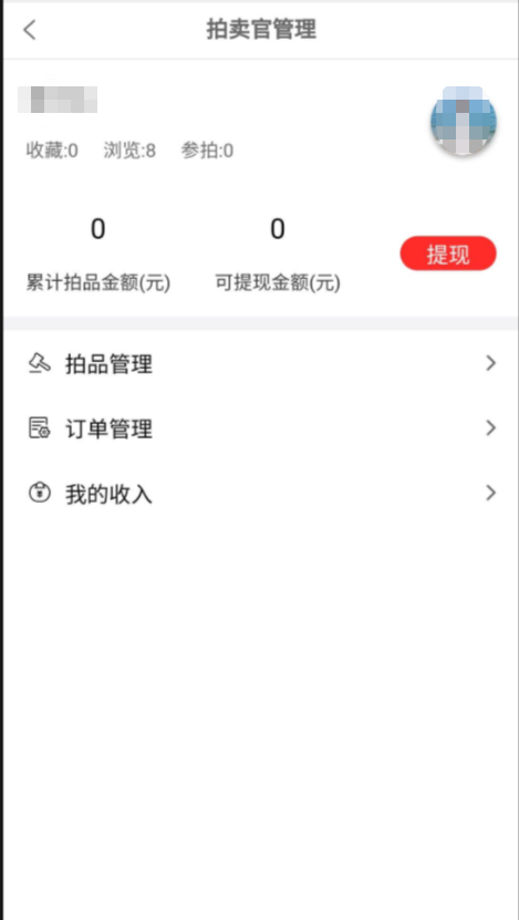 点击进入拍卖官店铺管理页面,拍品管理、订单管理、我的收入