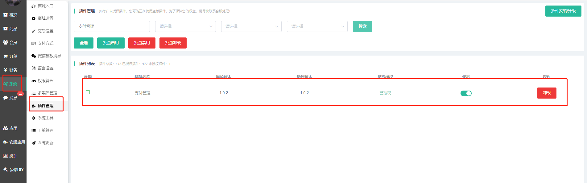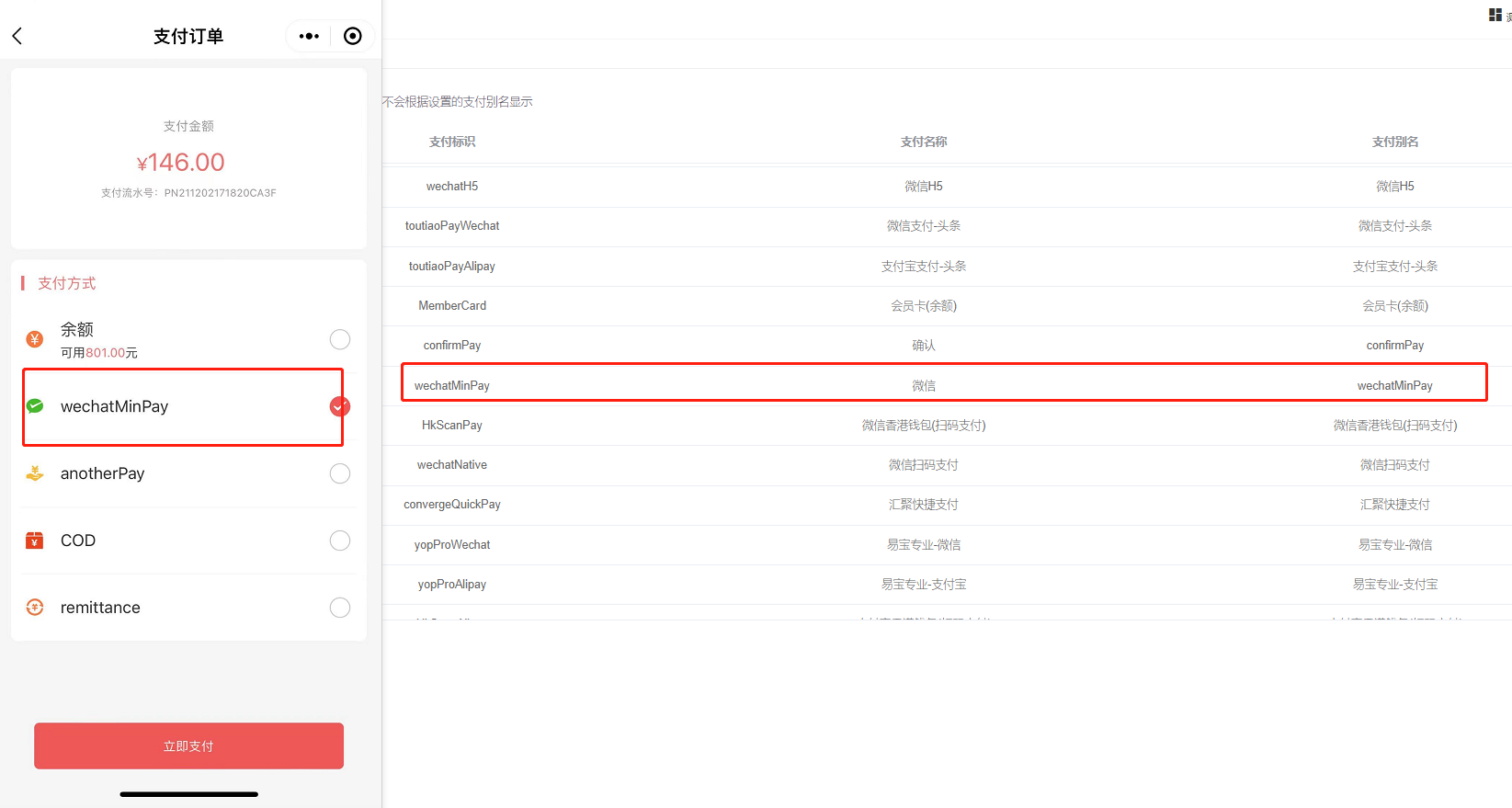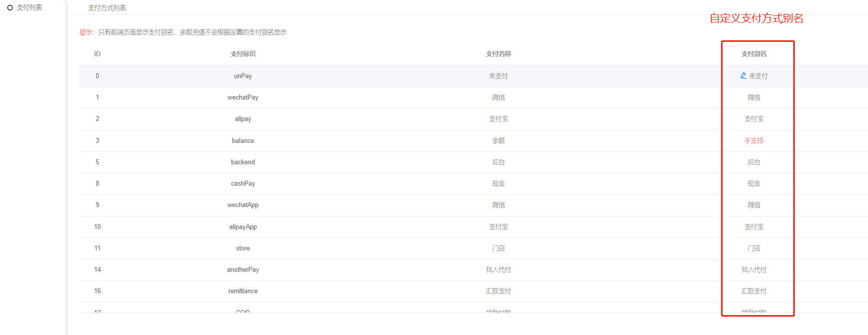 【支付管理】作者: aishidai / 2025年11月21日 功能简介:自定义支付名称。 注意事项:加了验证会过滤掉特殊符文,修改别名只支持中文数字字母。 一、总后台–系统–插件管理,启用“支付管理” 二、基础设置–支付列表,自定义商城支持的支付方式别名,前端支付页面随之同步改变。 前端支付页面显示效果如下: 三、支持公众号、小程序、商城APP的支付方式修改别名。 比如,小程序微信支付,支付标识是wechatMinPay, 商城APP支付标识是wechatApp 四、增加排序功能,数字越大,支付方式显示前面