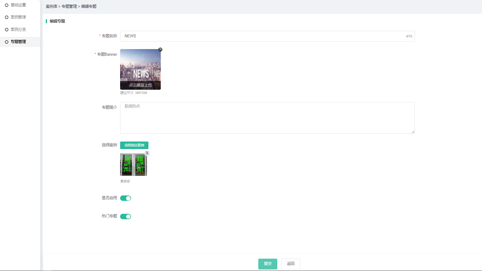 5、是否启用:启用则前端案例库专题列表有显示