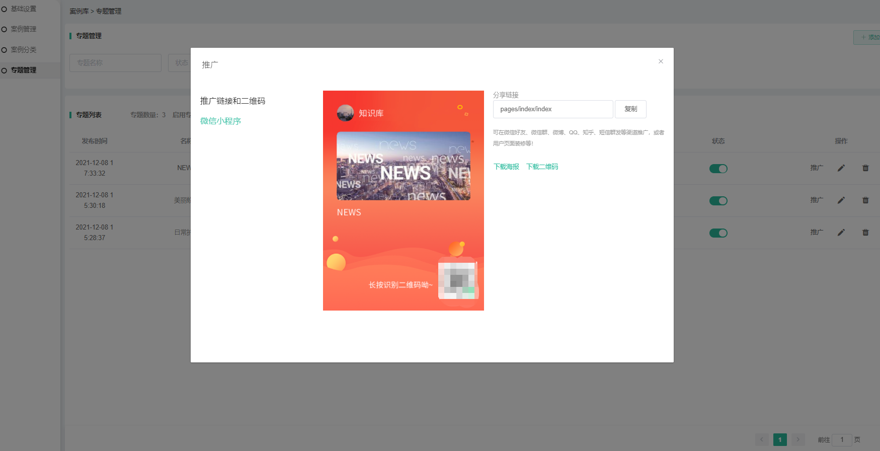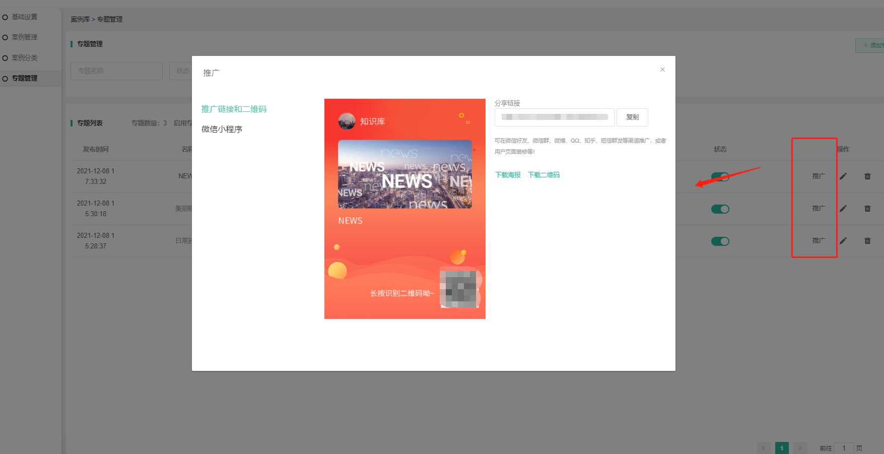 3、推广功能:点击可生成专题海报、专属分享链接、下载海报或二维码等