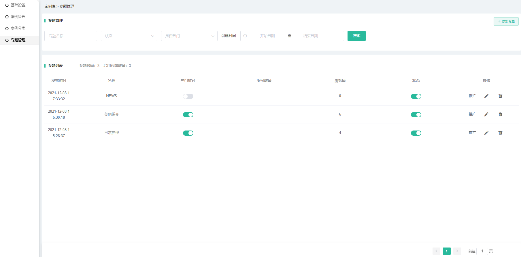 1、记录专题发布时间、专题名称、快速启用/关闭首页推荐/热门推荐、案例数量、浏览量、专题启用状态。