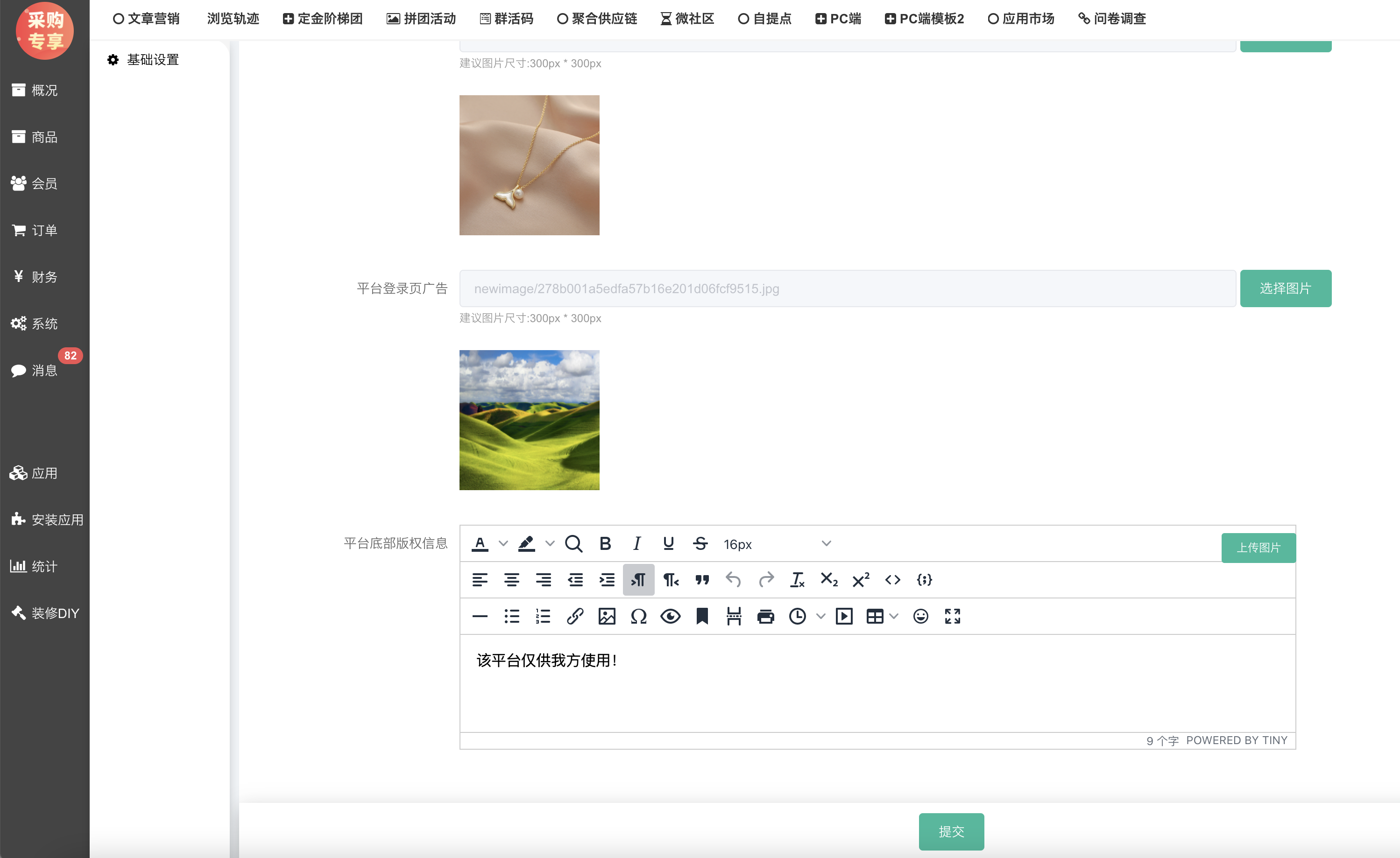 - 平台底部版权信息:企业管理PC端底部显示的版权信息,可自定义设置,如平台名称、地址、备案号等。