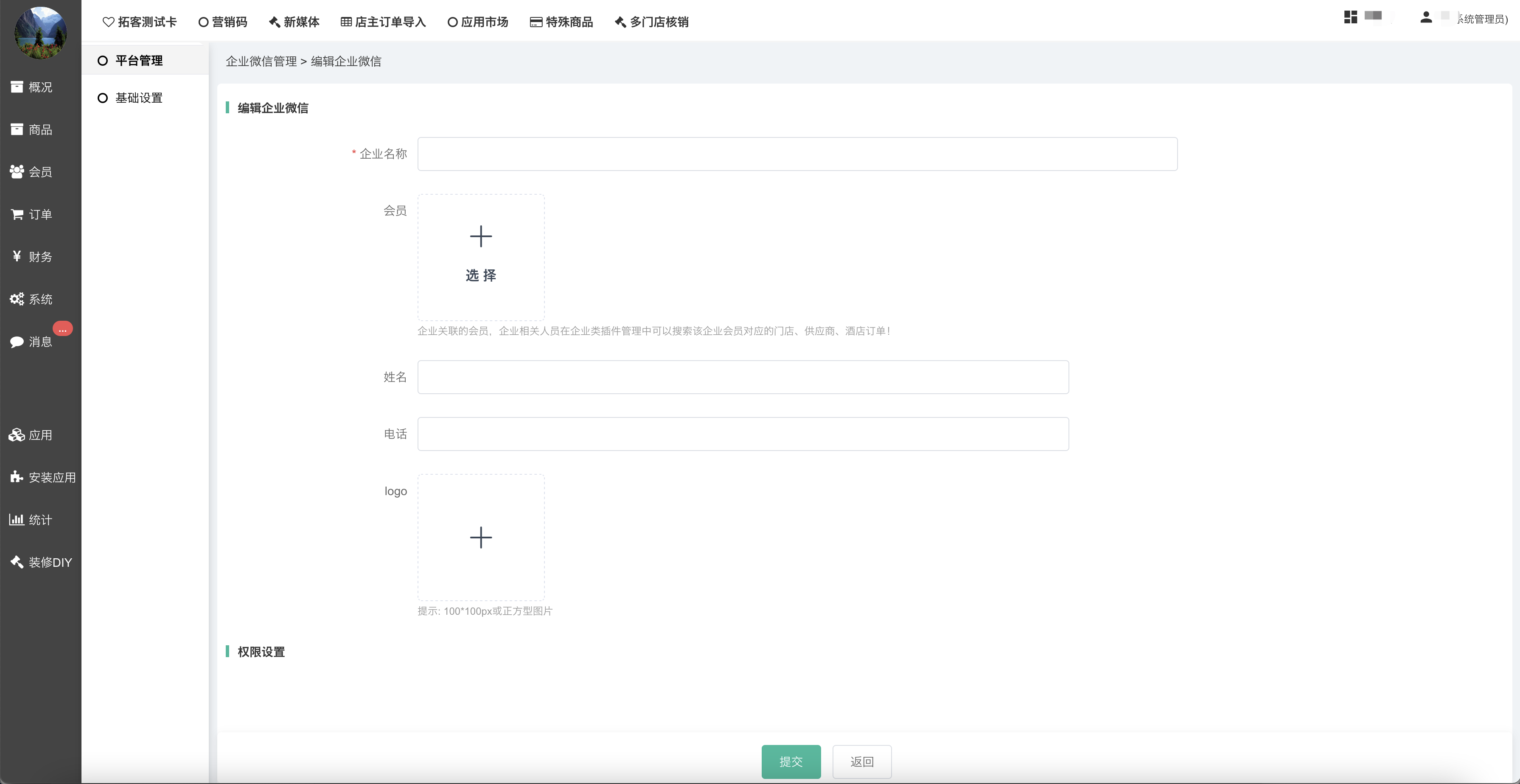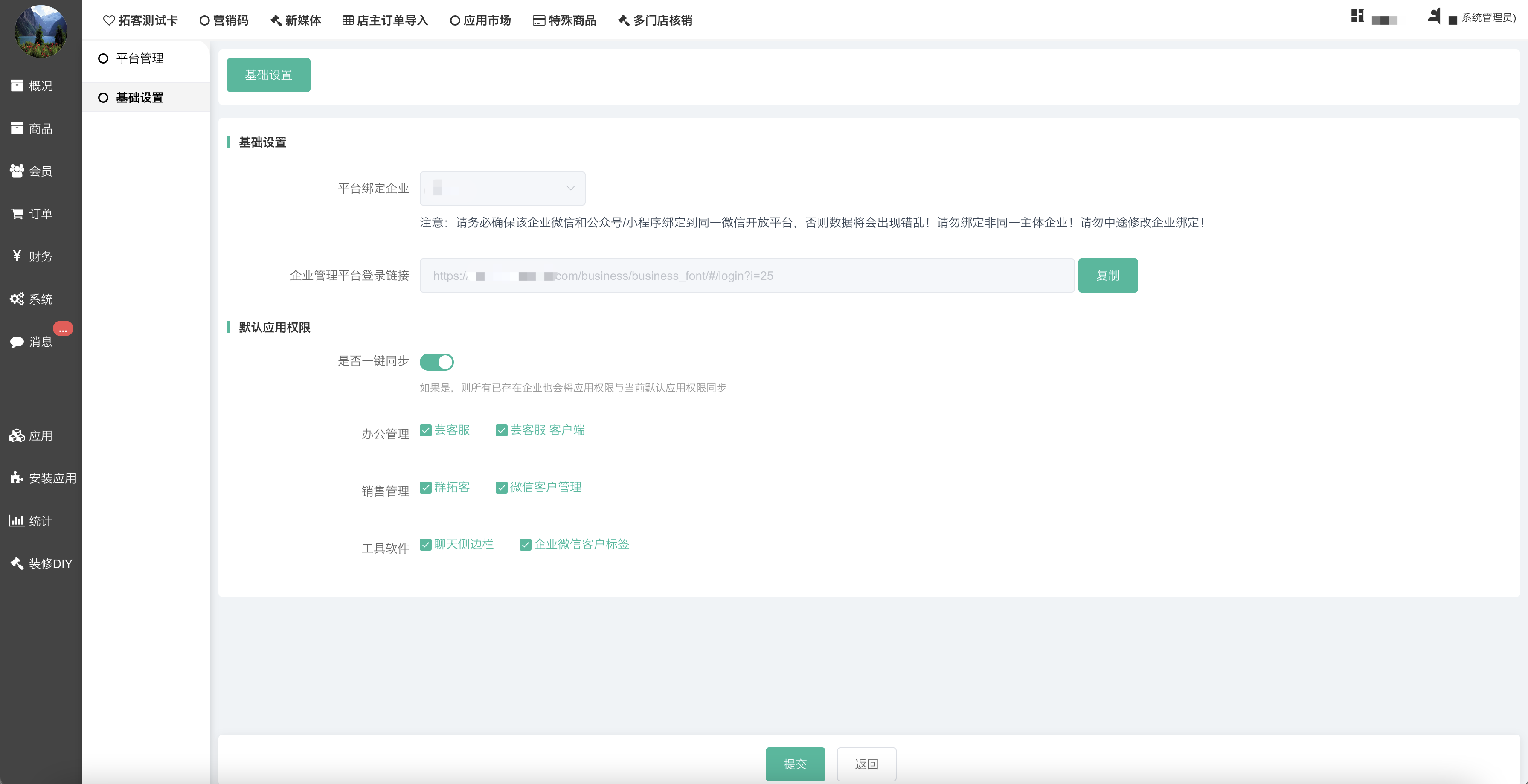 - 平台绑定企业:一个商城平台支持添加多个企业,但是因为一个商城平台只支持绑定一个微信公众号/小程序,使用平台绑定企业功能可以设置一个企业和商城进行关联;当使用企业微信进行会员拉新裂变、侧边栏管理等功能时可以同步商城数据。