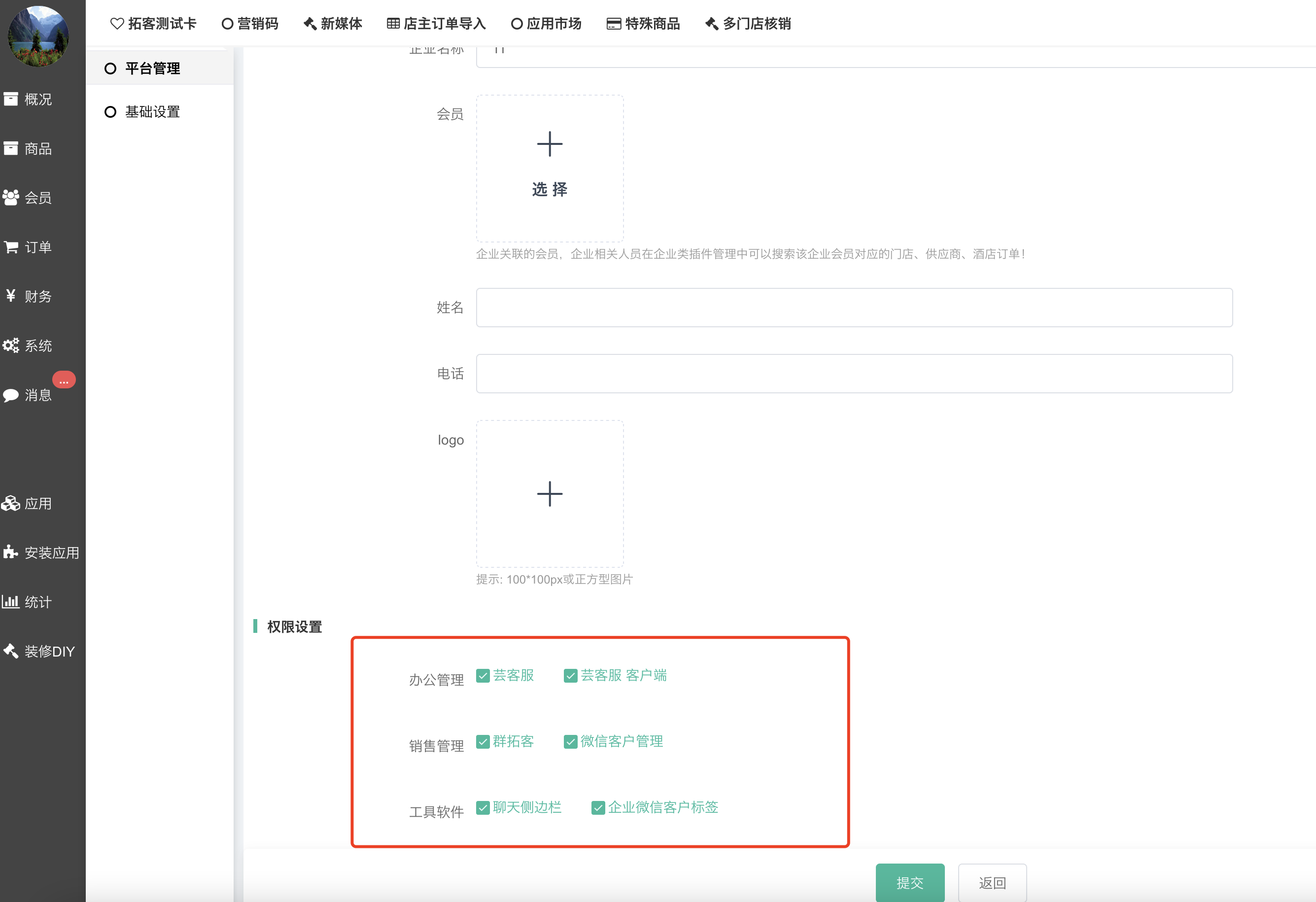 - 默认应用权限:创建企业后,该企业默认获得的应用权限,注意:不要全选,如果和商城关联数据的应用不要默认给所有企业使用,比如聊天侧边栏;