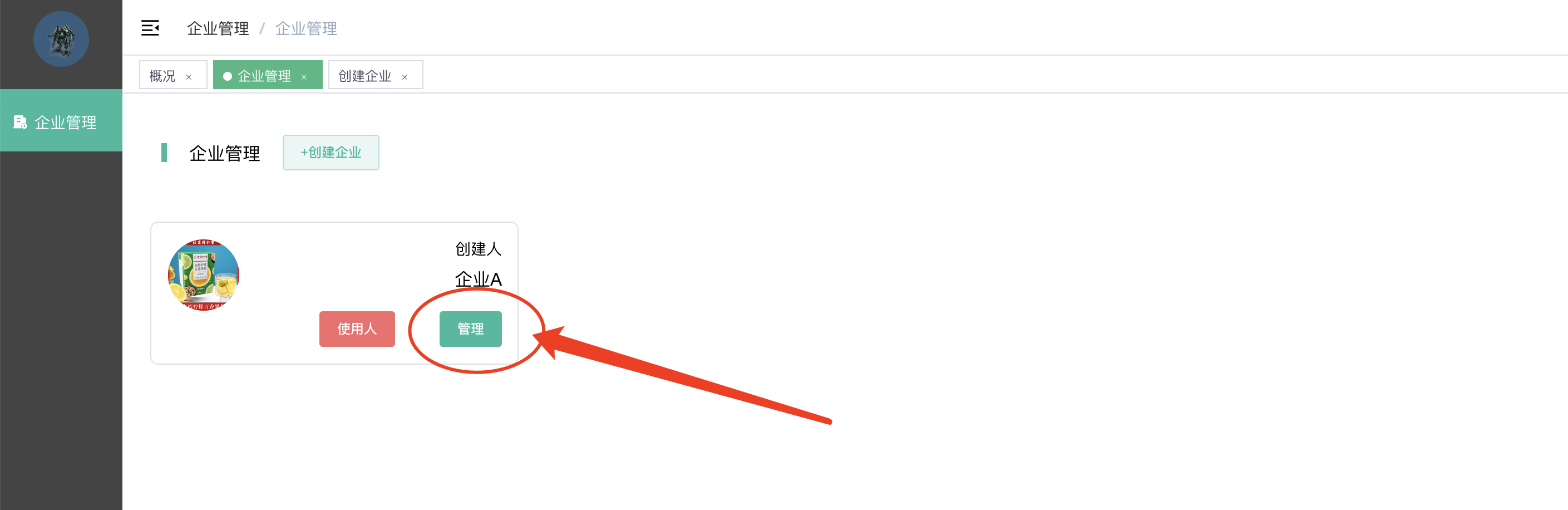 1、首次登录,进入企业管理页面,选择一个企业,再点击管理进入企业,如下图: