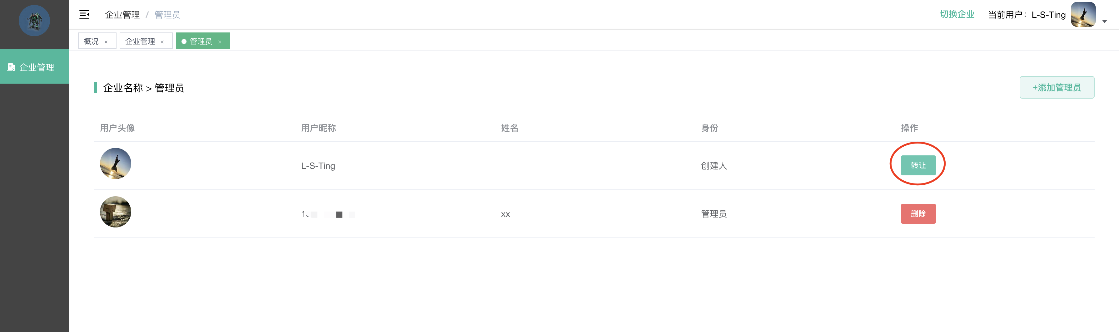 企业管理员:在企业管理界面,点击具体企业–使用人,可进入查看该企业全部的使用人。
