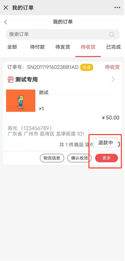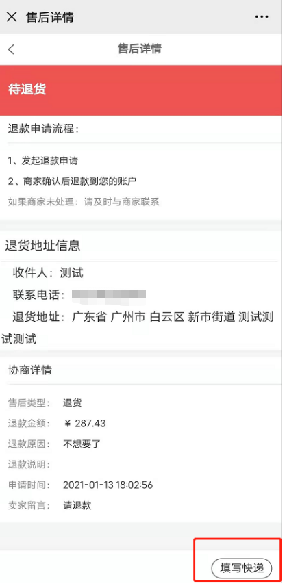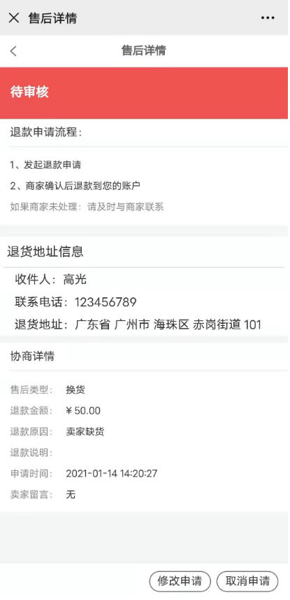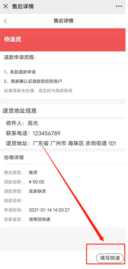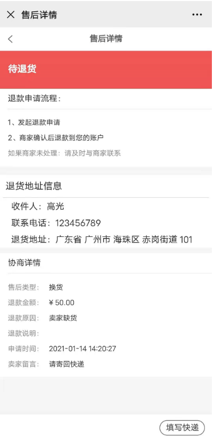 2) 商家通过申请后,买家会收到审核通过的通知,“退款中”的订单状态自动变成“待退货”状态,点击查看详情填写退