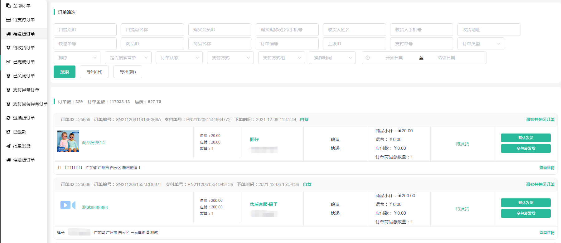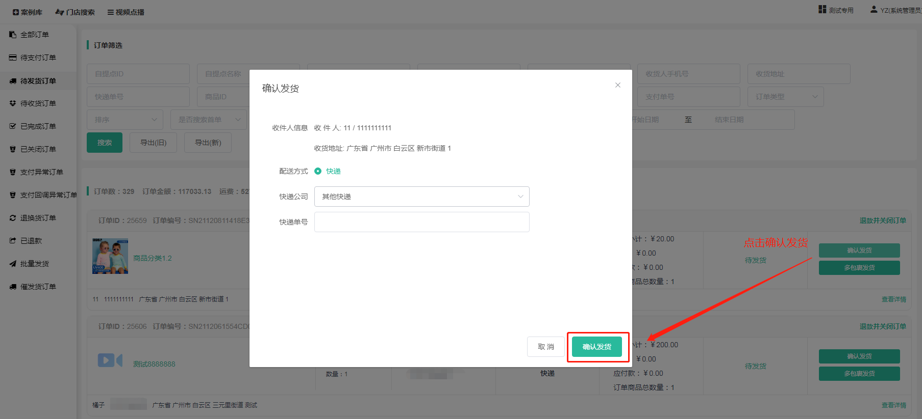 > 2.1、商家查看确保信息无误后,则可回到待发货列表中或在订单详情中点击【确认发货】。点击确认发货–弹出窗口显示快递信息—收件人信息为收件人姓名/手机号码以及收货地址选择快递公司–填写物流单号。