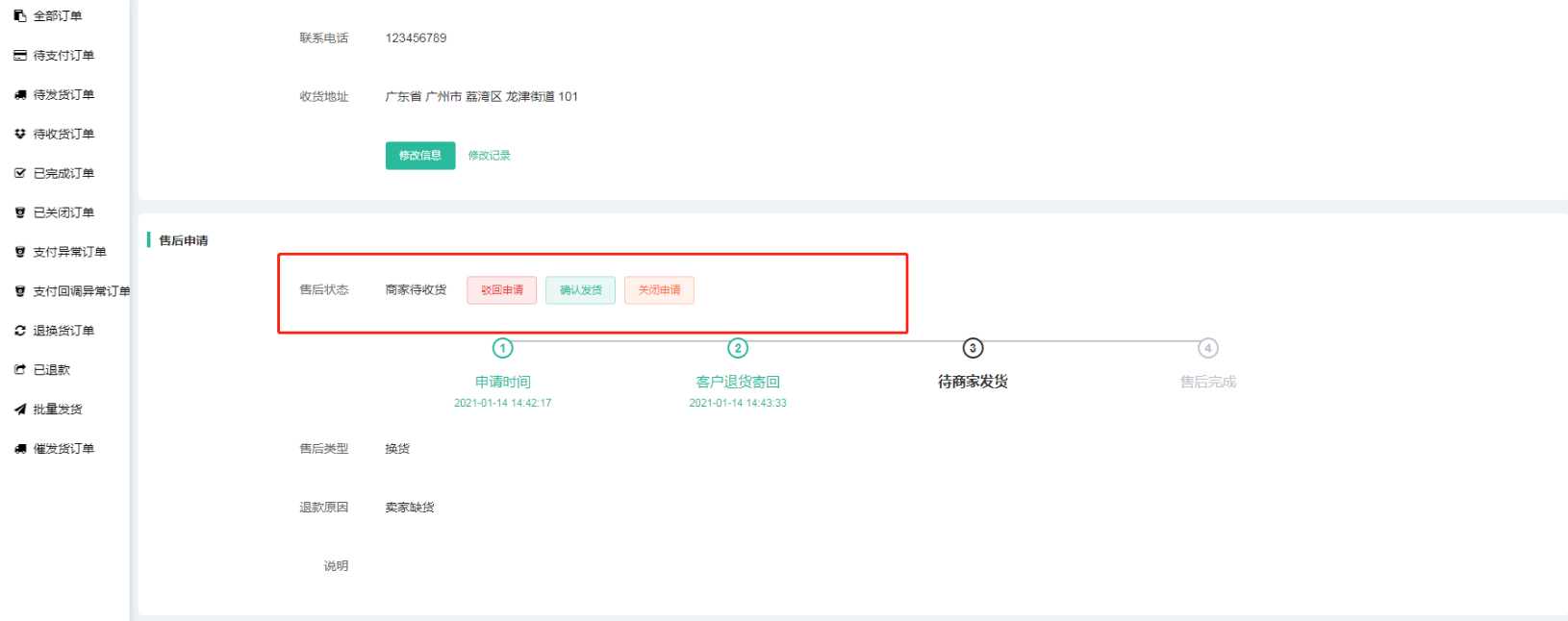 商家在“后台–订单管理–退换货订单”中查看到买家申请售后订单,点击查看订单详情。在订单详情页面下拉“退款申请”点击处理退款申请。