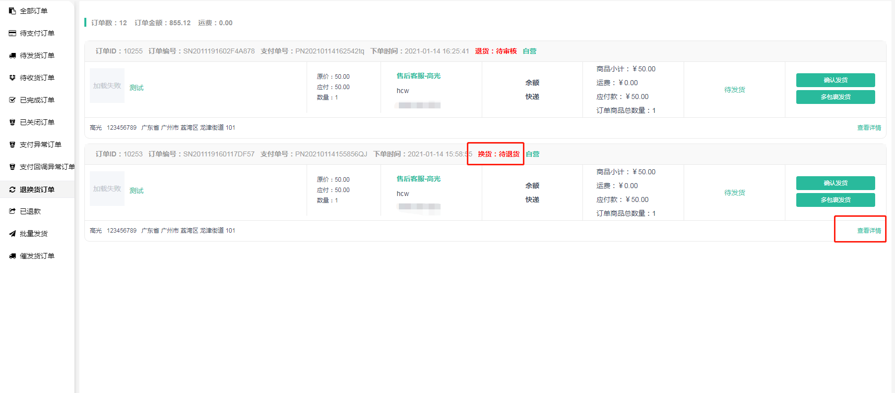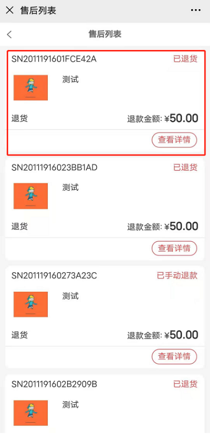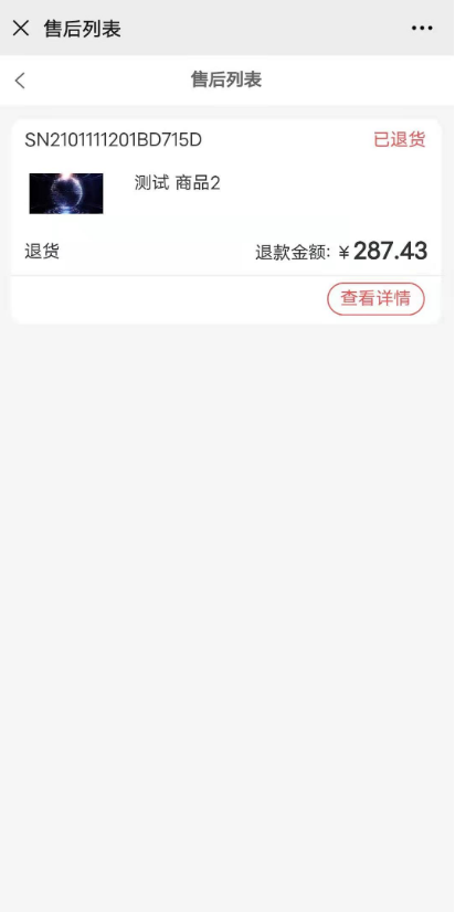 商家可在“后台–订单管理–退换货订单–退款退货”中查看到买家申请售后的订单,点击查看详情。