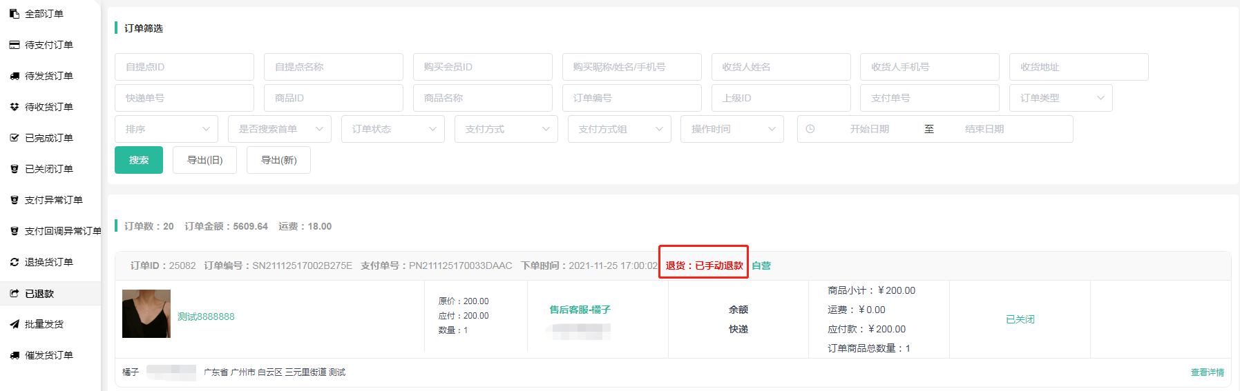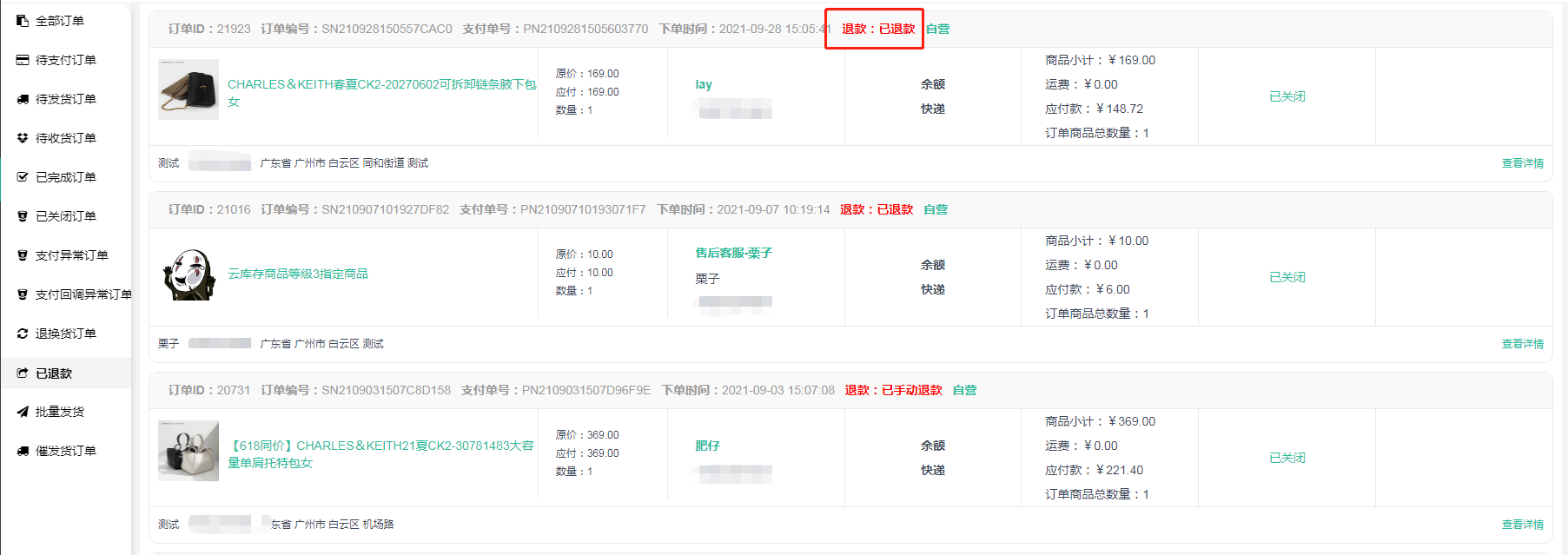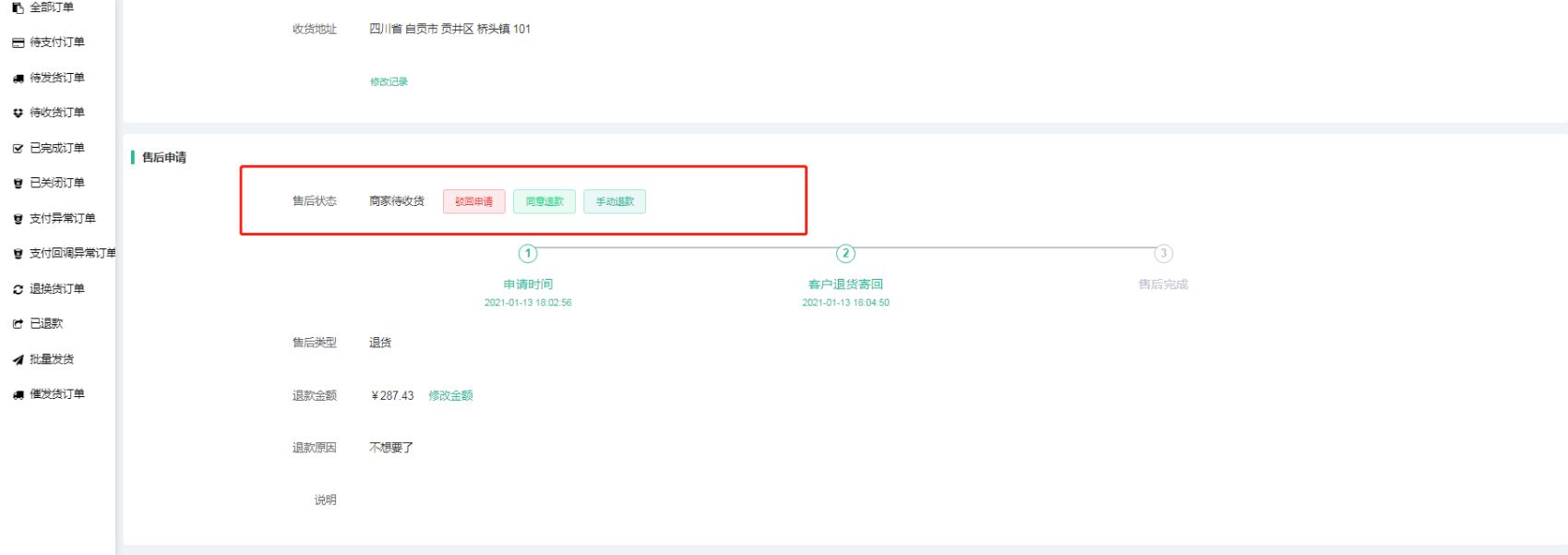 3) 商家收到买家寄回的退件,确认无误后可在退货申请处点击同意退款或者手动退款,如下以同意退款为例