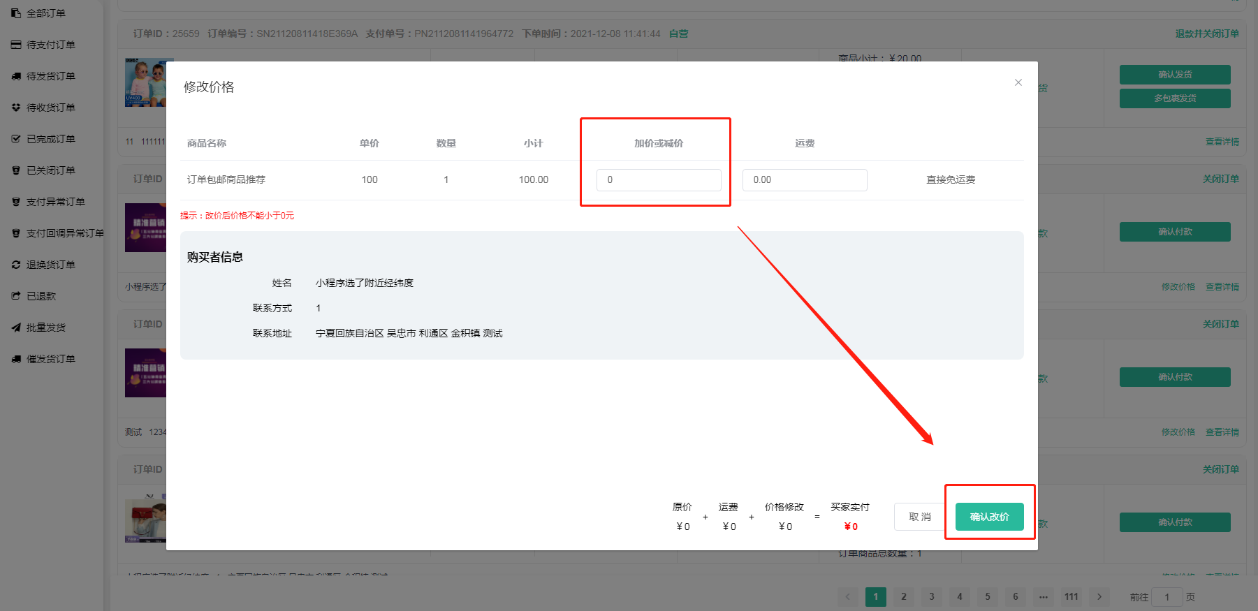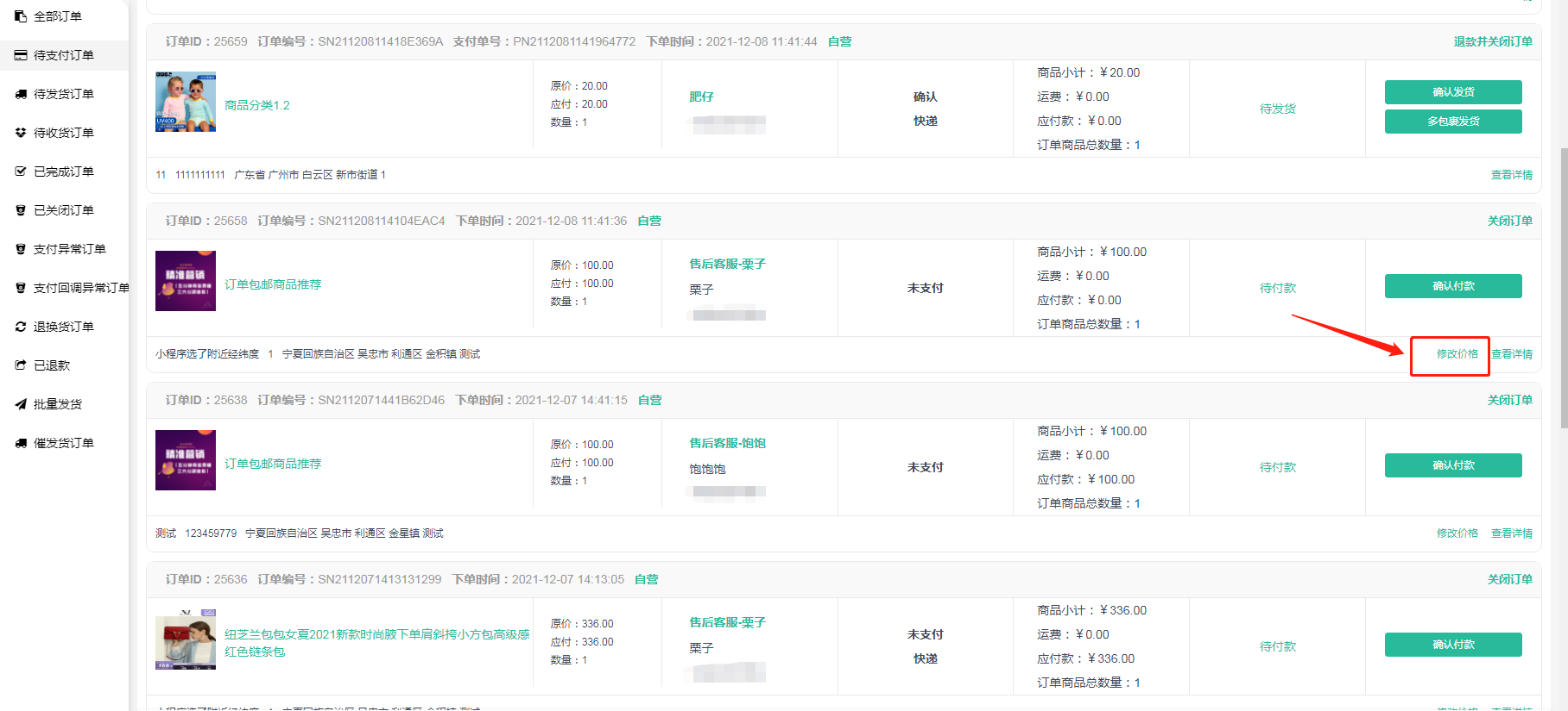 ⑵ 当买家下单还未付款时,商家可以在“订单管理-待支付订单”进行订单改价操作。如原基础上加价200元和10元运费(若在金额前输入“ —— ”号,则为减价)。