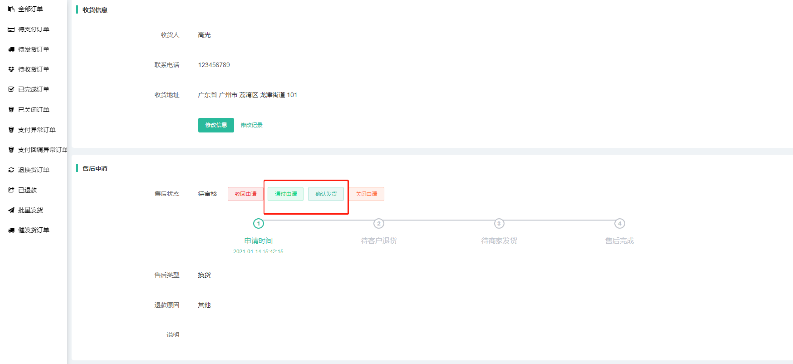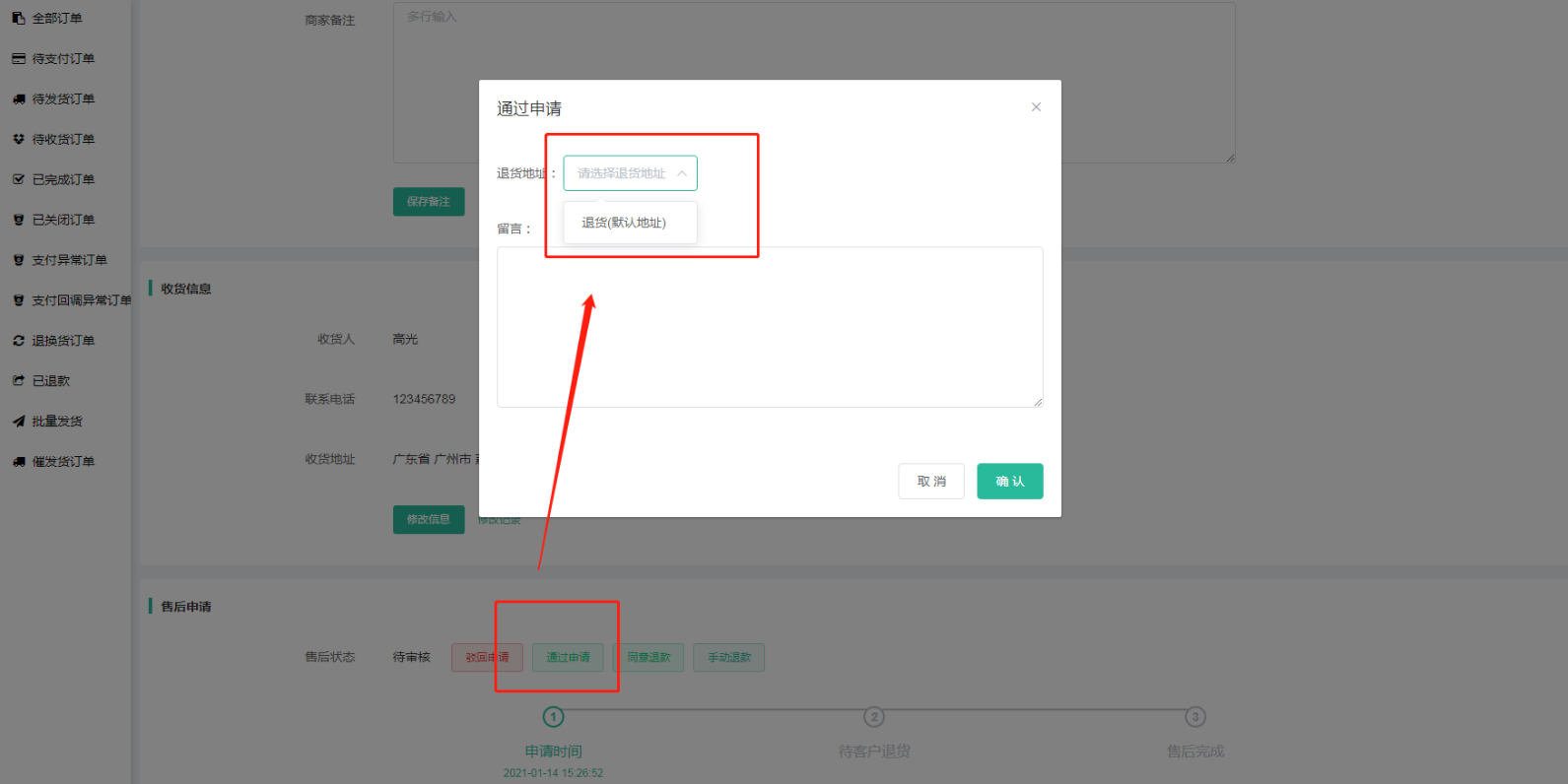 处理结果有三种:一驳回,二通过申请(需客户寄回商品),三确认发货(无需客户寄回商品)