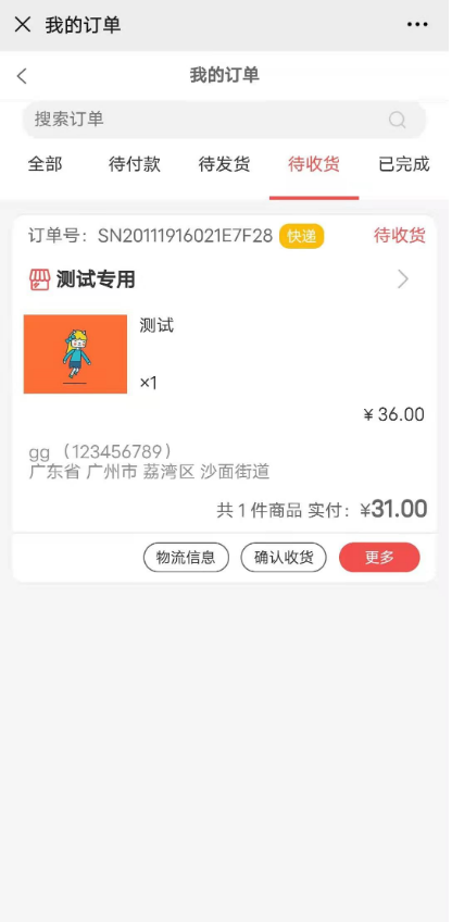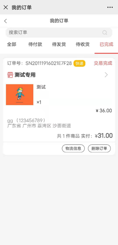 4.确认收货之后订单状态就会自动变为“已完成”状态