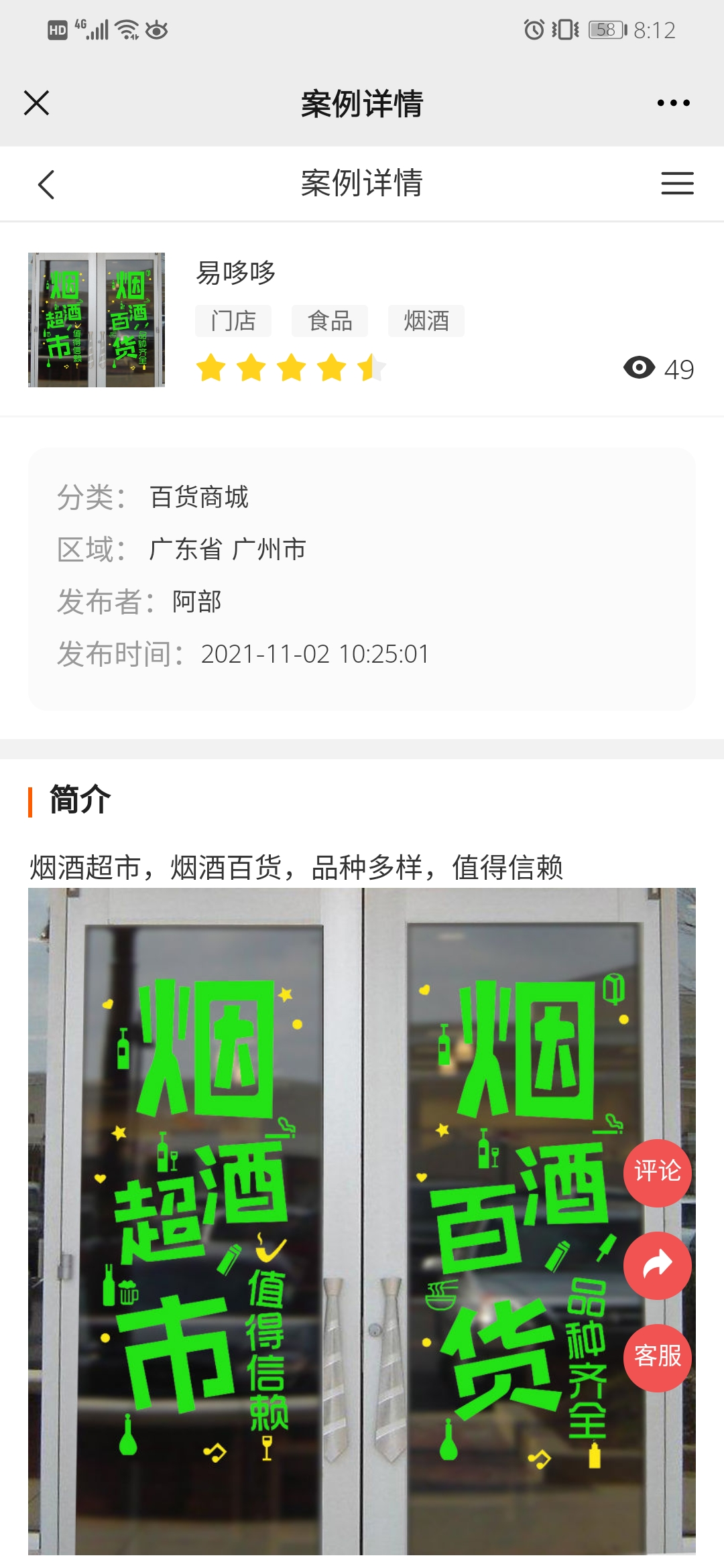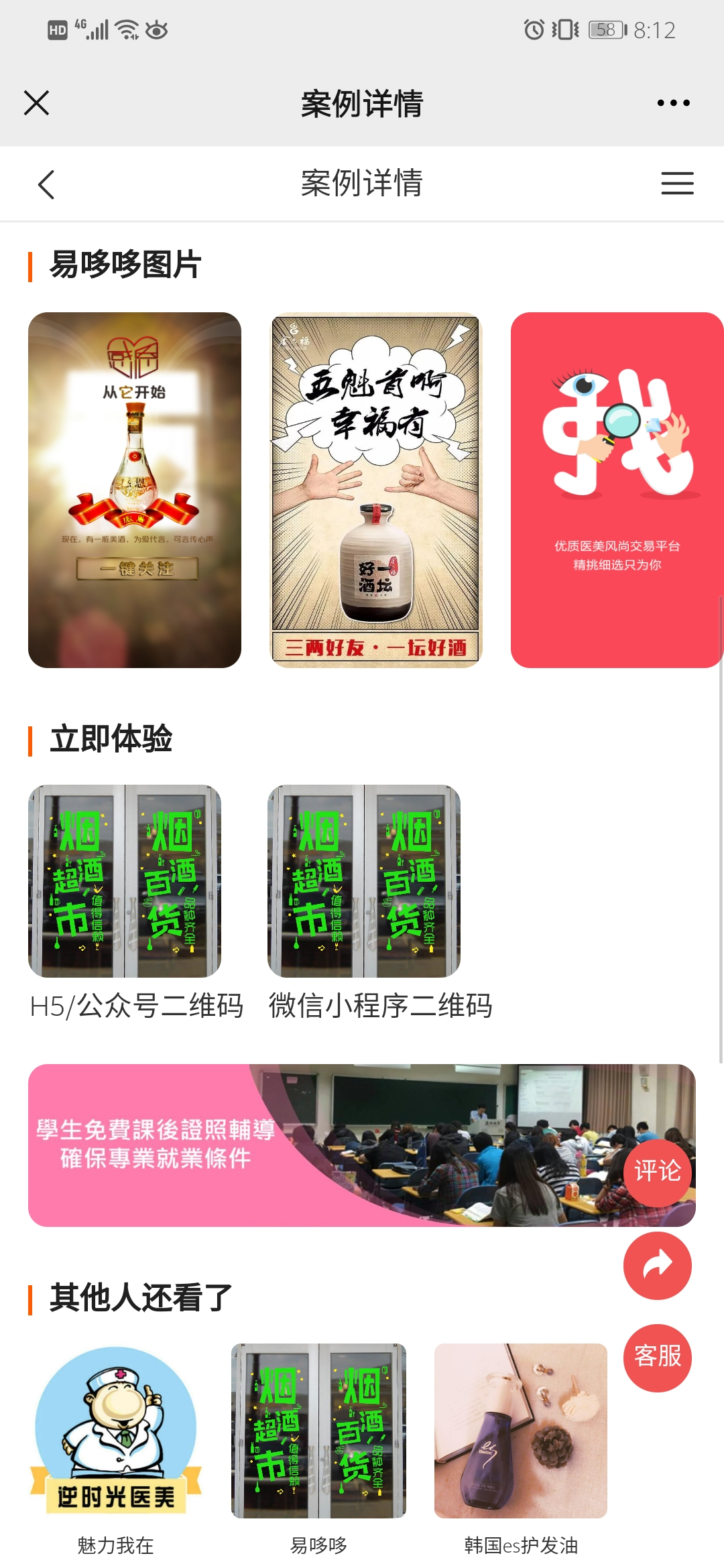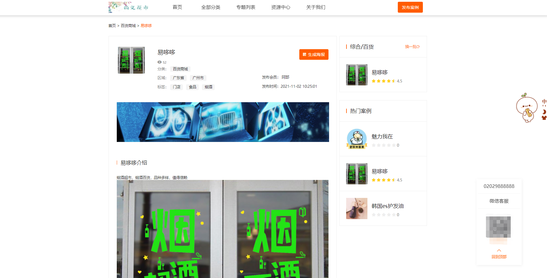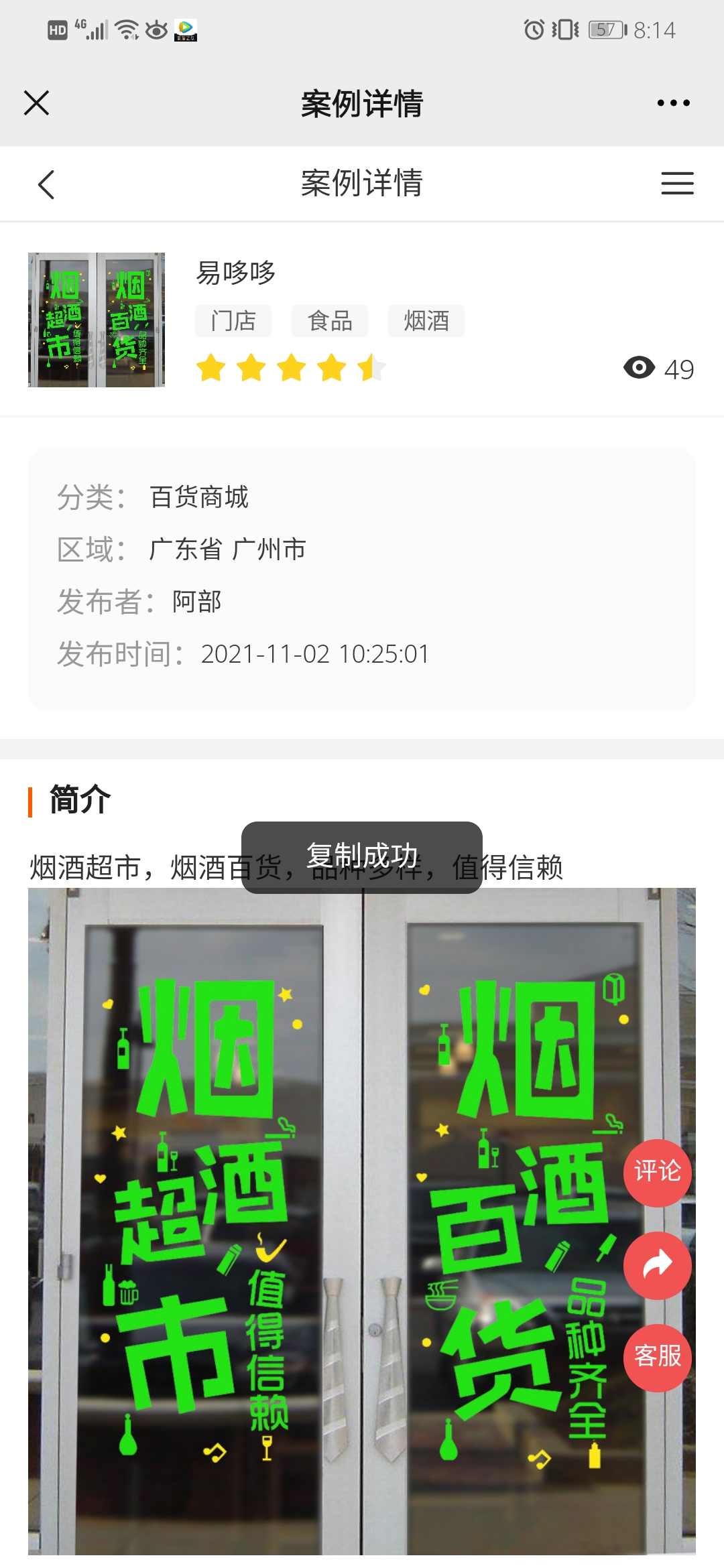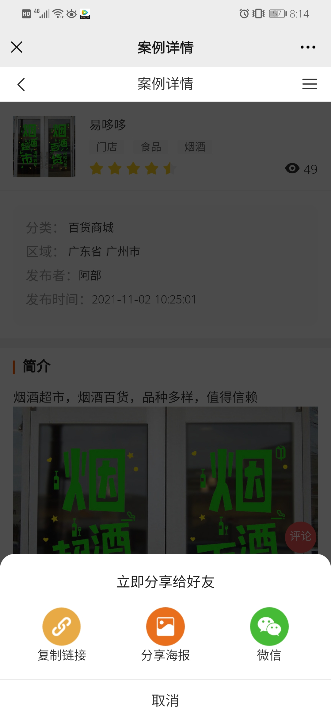 分享生成海报效果如下(顶部则为商城logo和商城名称、案例名称以及案例标签、案例二维码)