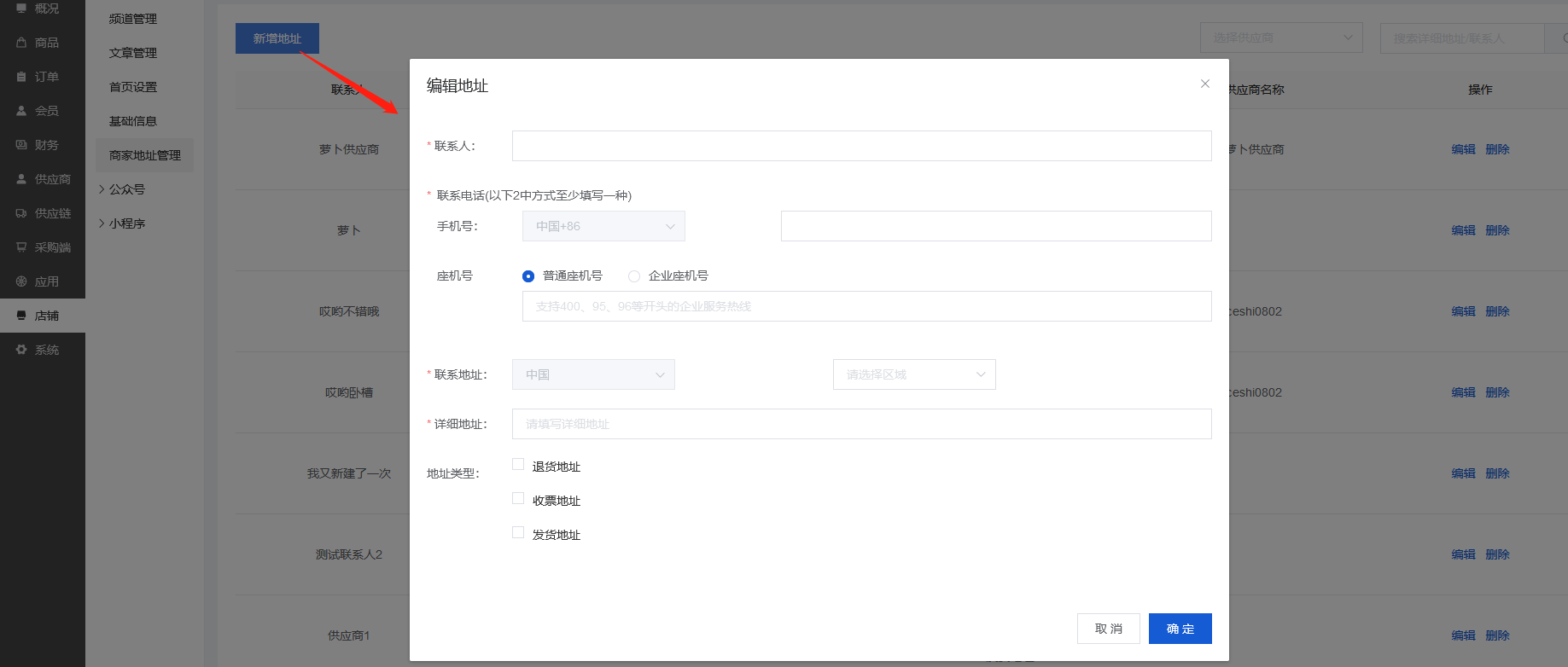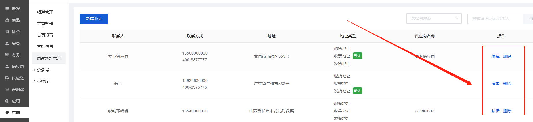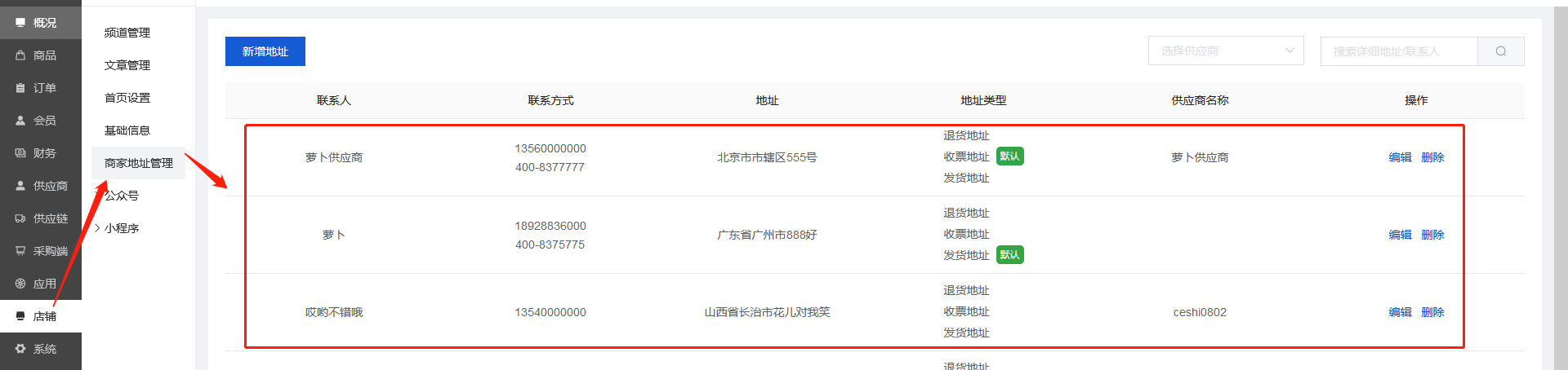 1.显示所有商家地址,包括供应商添加的地址、中台添加的地址