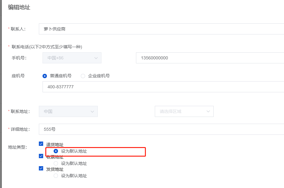 5.地址可以设置为默认地址,但是一个地址只能设置为一种类型的默认地址;