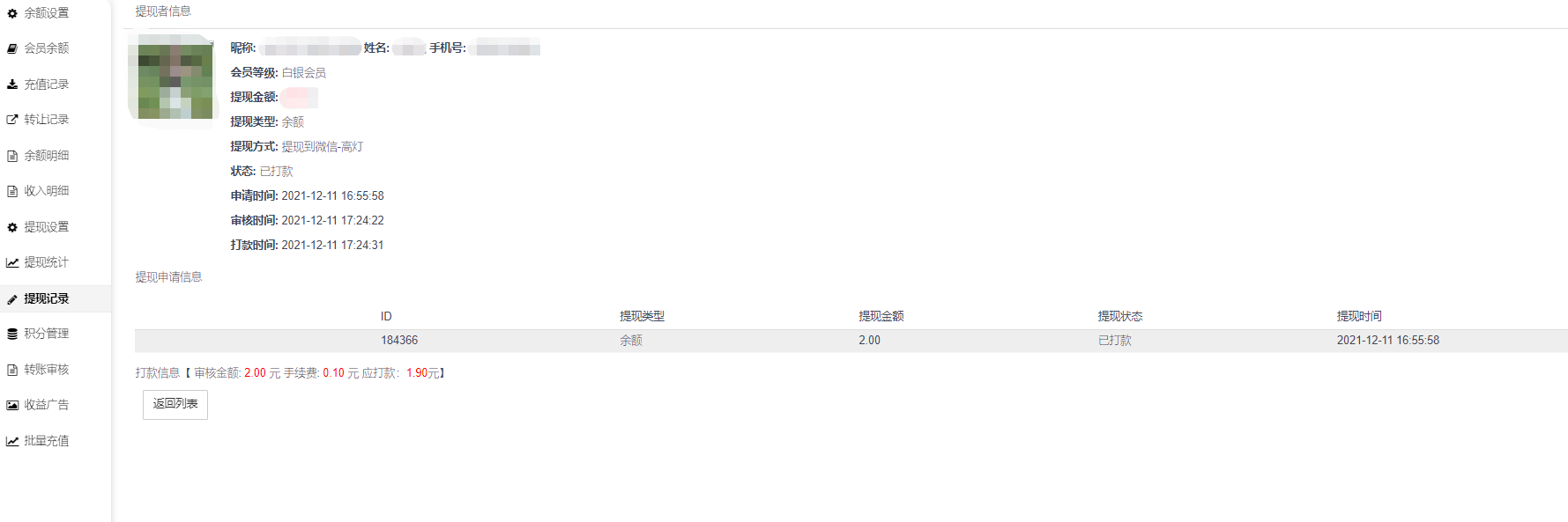 4、待打款状态可进行高灯打款操作,成功后会生成高灯打款记录,可在插件【高灯提现】打款列表中查看进度以及状态