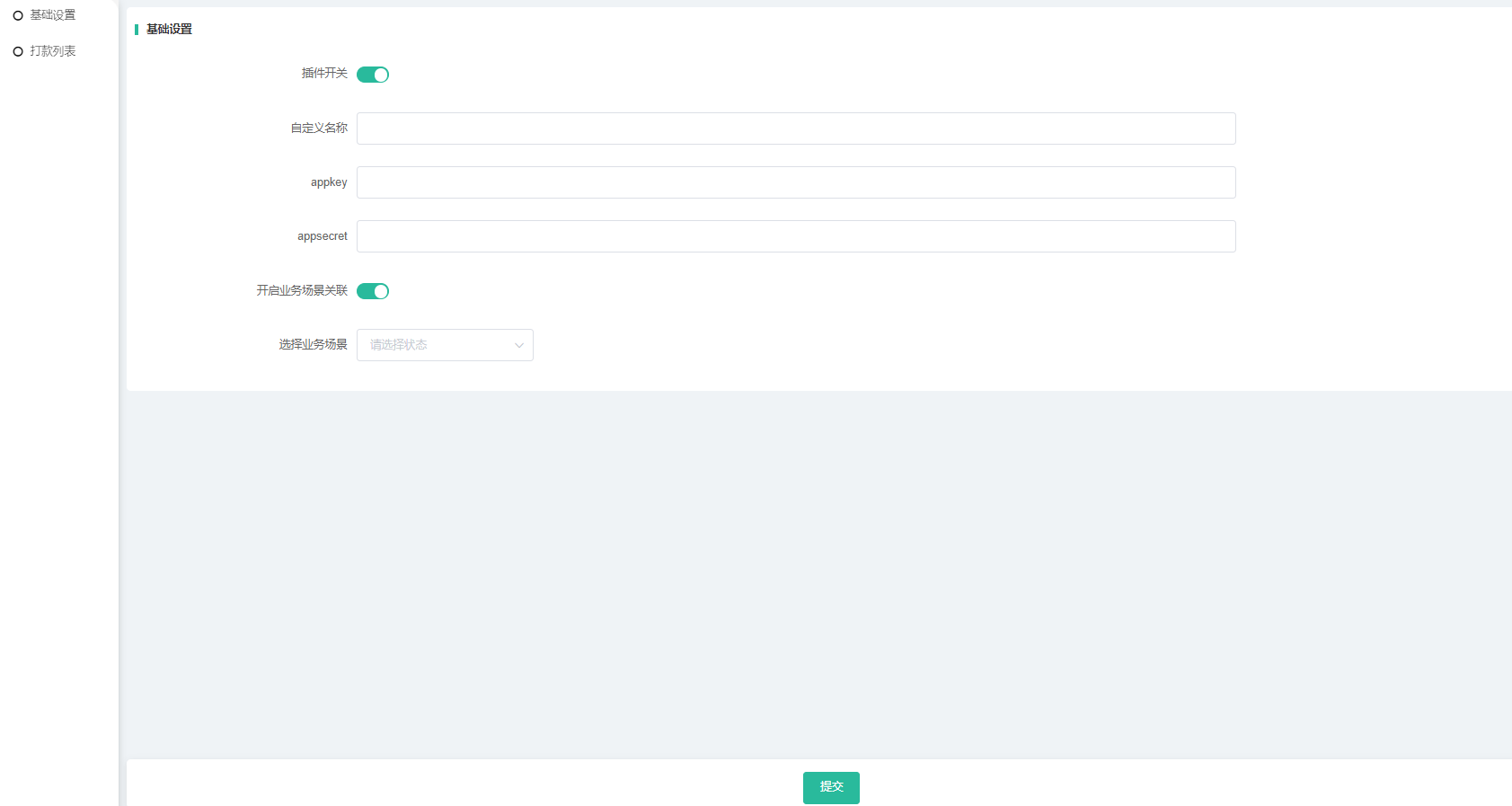 1、插件开关:开启插件必须填写配置信息,否则不允许开启,需要关闭