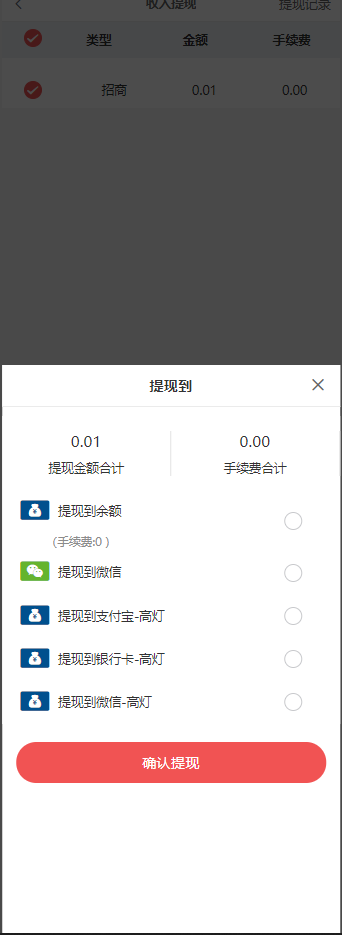 1、用户进行提现时可选择提现方式