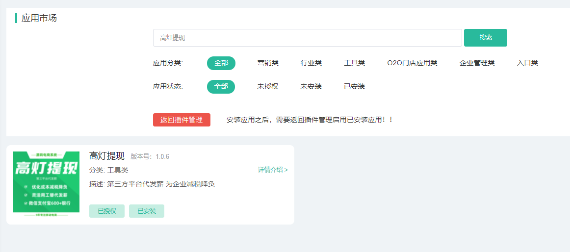 启用路径:总后台–系统–插件管理–启用高灯提现