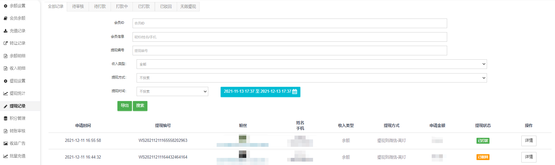 2、可对提现记录进行审核、驳回、打款
