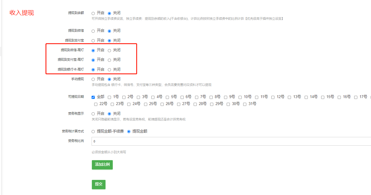 2、到收入提现设置中开启相关的高灯提现方式,有三种,前台用户进行收入提现时选择提现方式为高灯提现-微信、支付宝、银行卡时即可进行高灯提现。