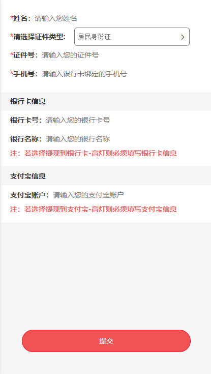 2、选择高灯提现时,会先判断有无进行高灯签约,没有的话先跳转页面填写信息,填 完之后会进行跳转高灯H5页面完成后续签约操作(注意测试千万别用假的数据,一旦跳转到高灯那边假的数据就绑定了你的微信,后续更改需要联系高灯客服那边改)